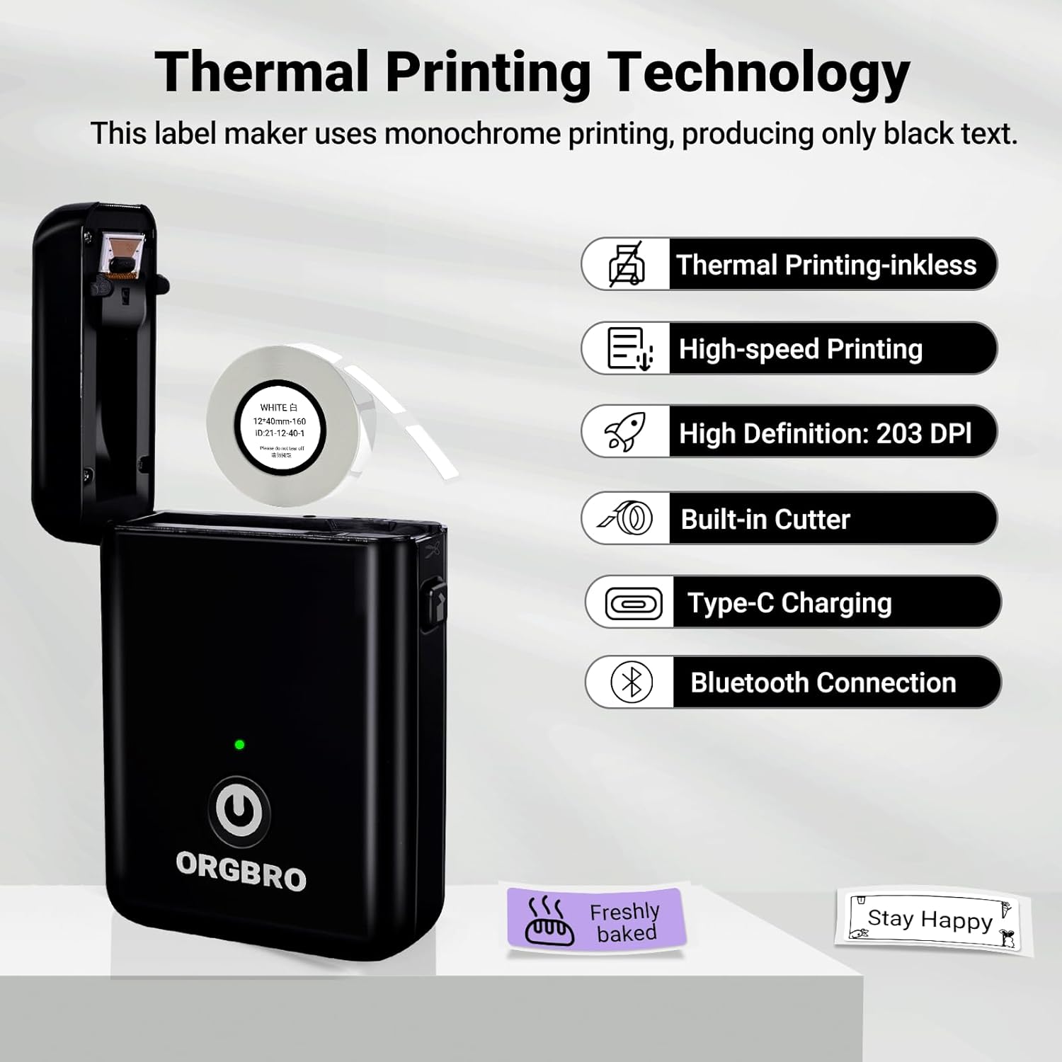 - Label Durability: ORGBRO label maker comes with a roll of 12 x 40 mm white pre-cut labels; ORGBRO labels waterproof, oil-resistant, and abrasion-resistant. No residue remains after removal; Supports continuous label paper (15 mm width) and fixed-length labels (12 x 40 mm); We recommend using ORGBRO thermal label paper for optimal print quality