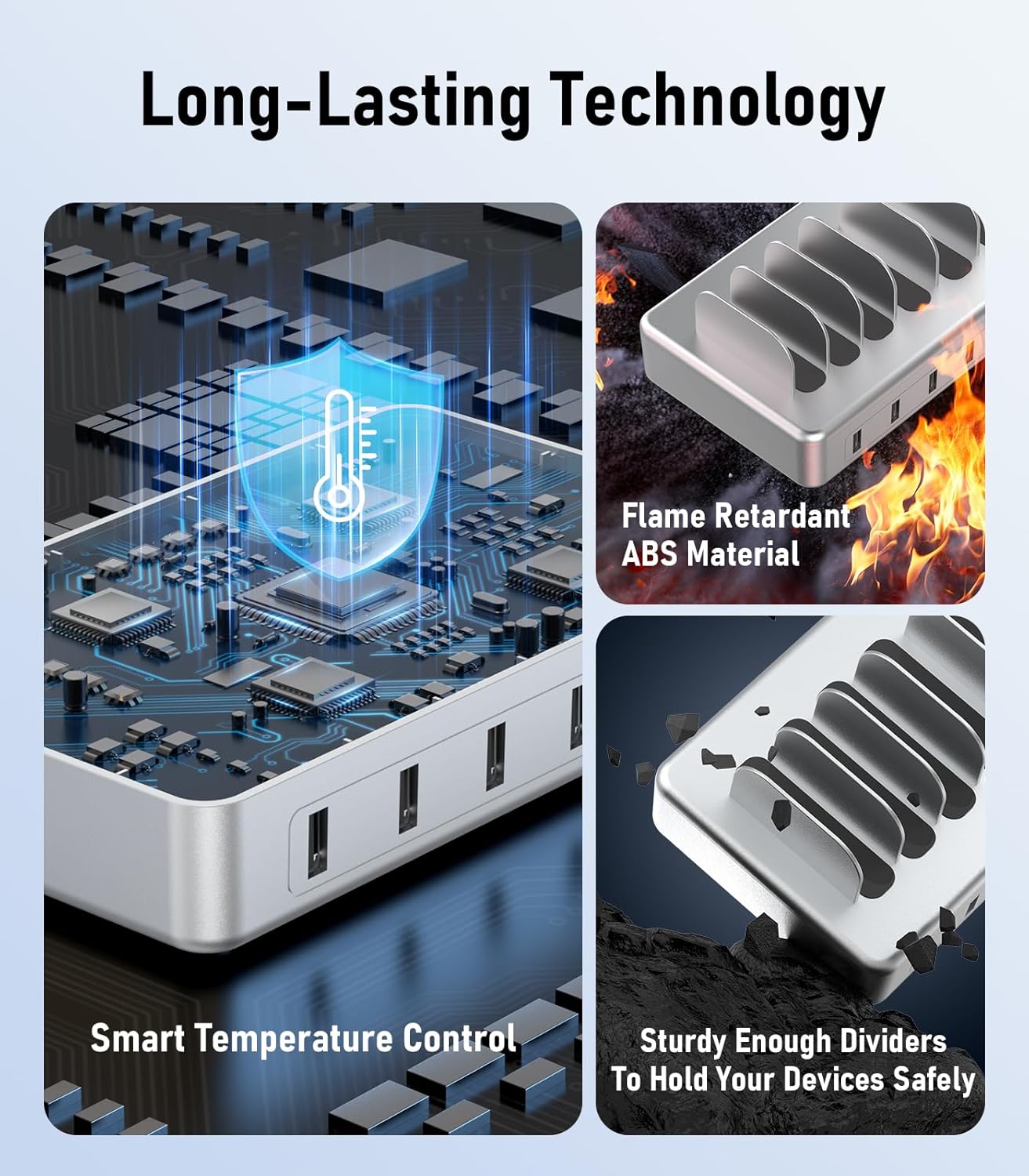 - 【Multi-Device Compatibility】The iphone charging station comes with 6 short cables and a Type-A to Type-C Adapter Converter, which is compatible with most usb devices for charging. CREATIVE DESIGN charger station keeps your devices nicely organized in a row, and there are no more adapters and tangled cords everywhere