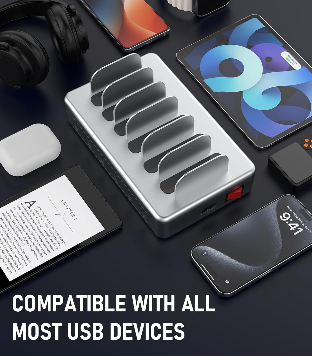 - 【Multi-Scenario Application】The charging station for apple devices has 6 smart USB ports that put all your devices in one place.Each port provides up to 5V/2.4A of current.The charging dock has an auto-detection feature that assigns the perfect amount of power to each charging device.Perfect for home, office, school, restaurant, and hotel use, it can accommodate all your family's devices