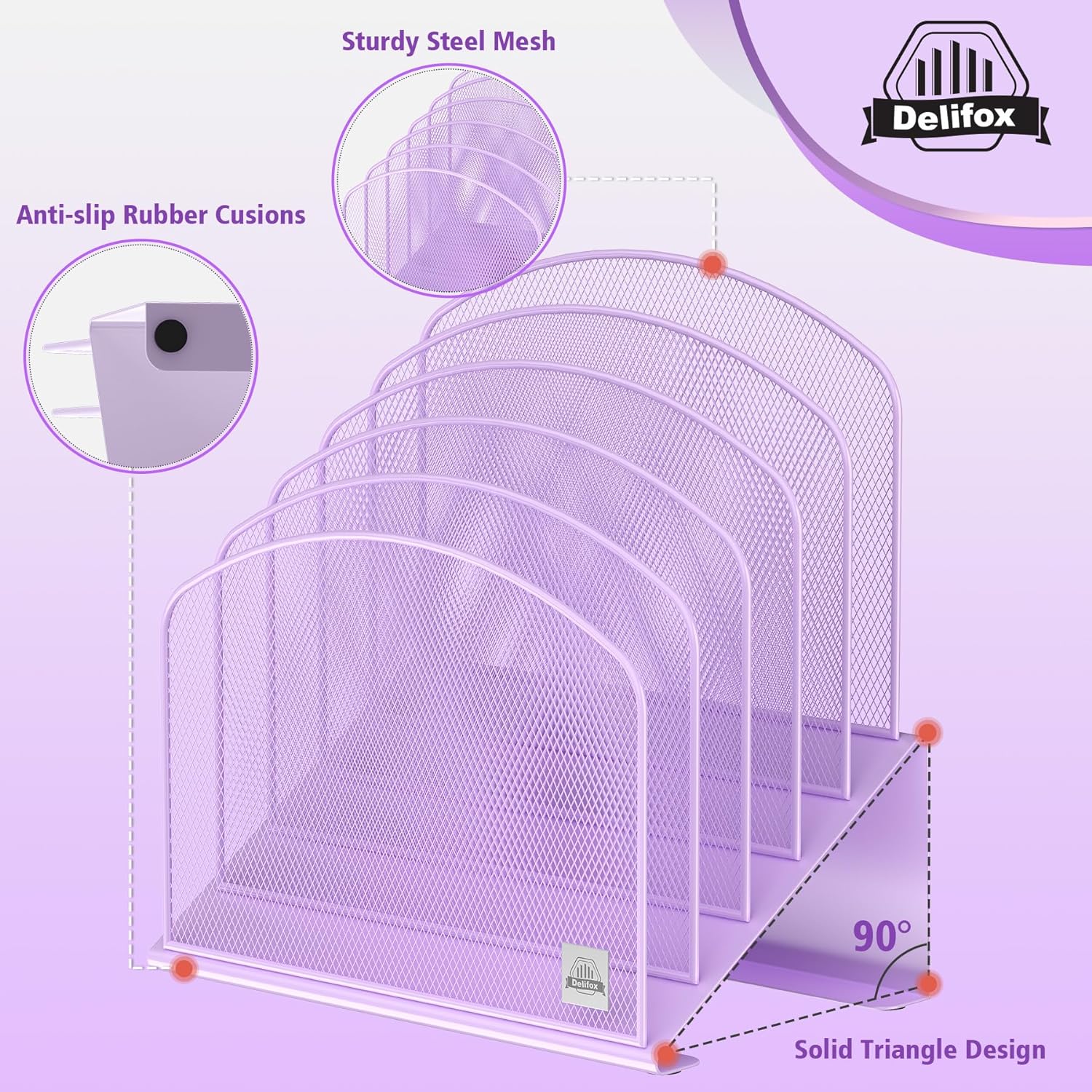 Inclined Desk File Organizer, 5-Section Vertical File Folder Holder Stand Metal Rack File Sorter for Office Classroom Desktop Organization (Purple, 2Pack)
