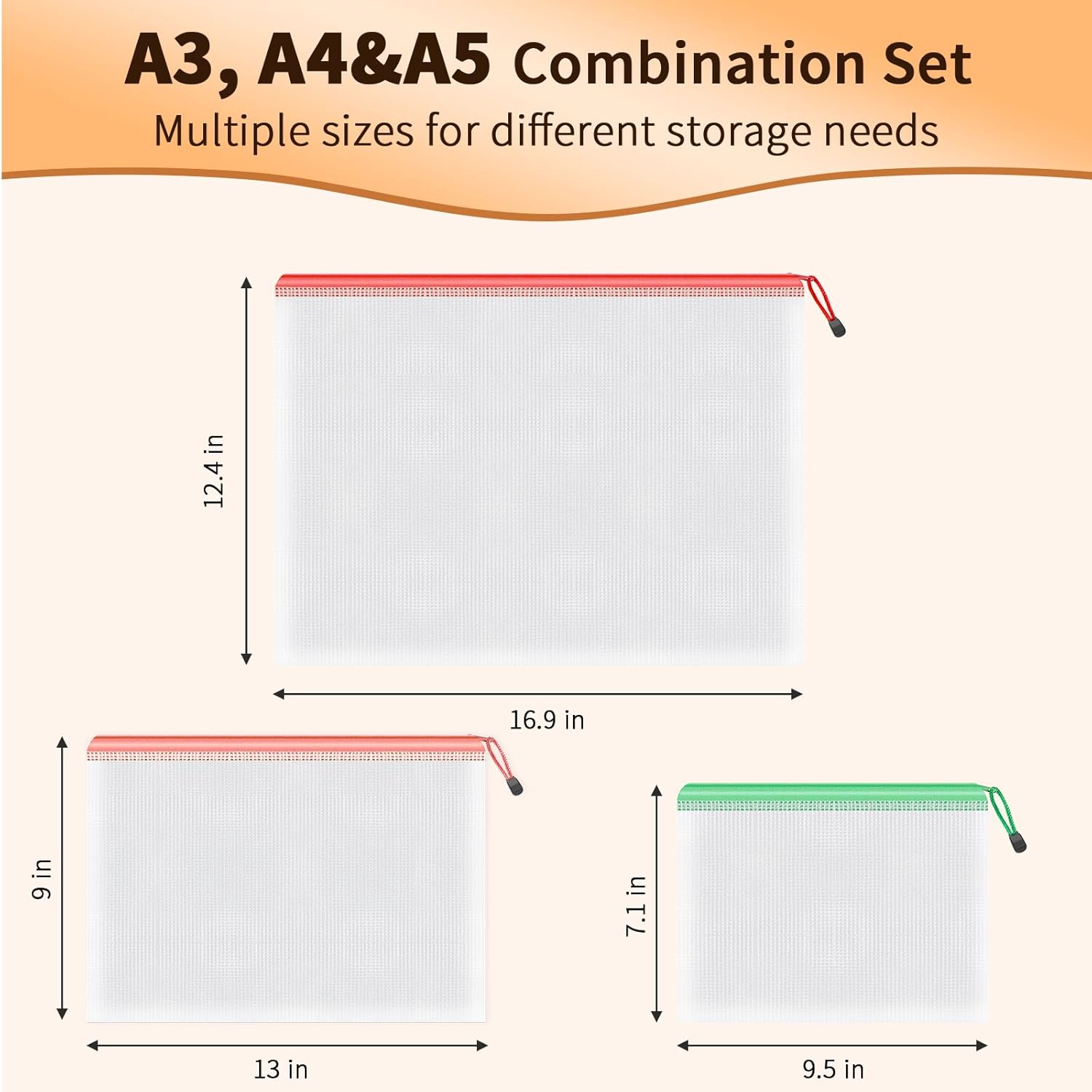 - What You Can Get: You will get a set of 18 packs plastic zipper pouches for storage. 3 Size-6*A3(16.9x12.4 in), 6*A4(13.0x9.0in), 6*A5(9.5x7.1 in), multisize design can meet your storage needs of different size items