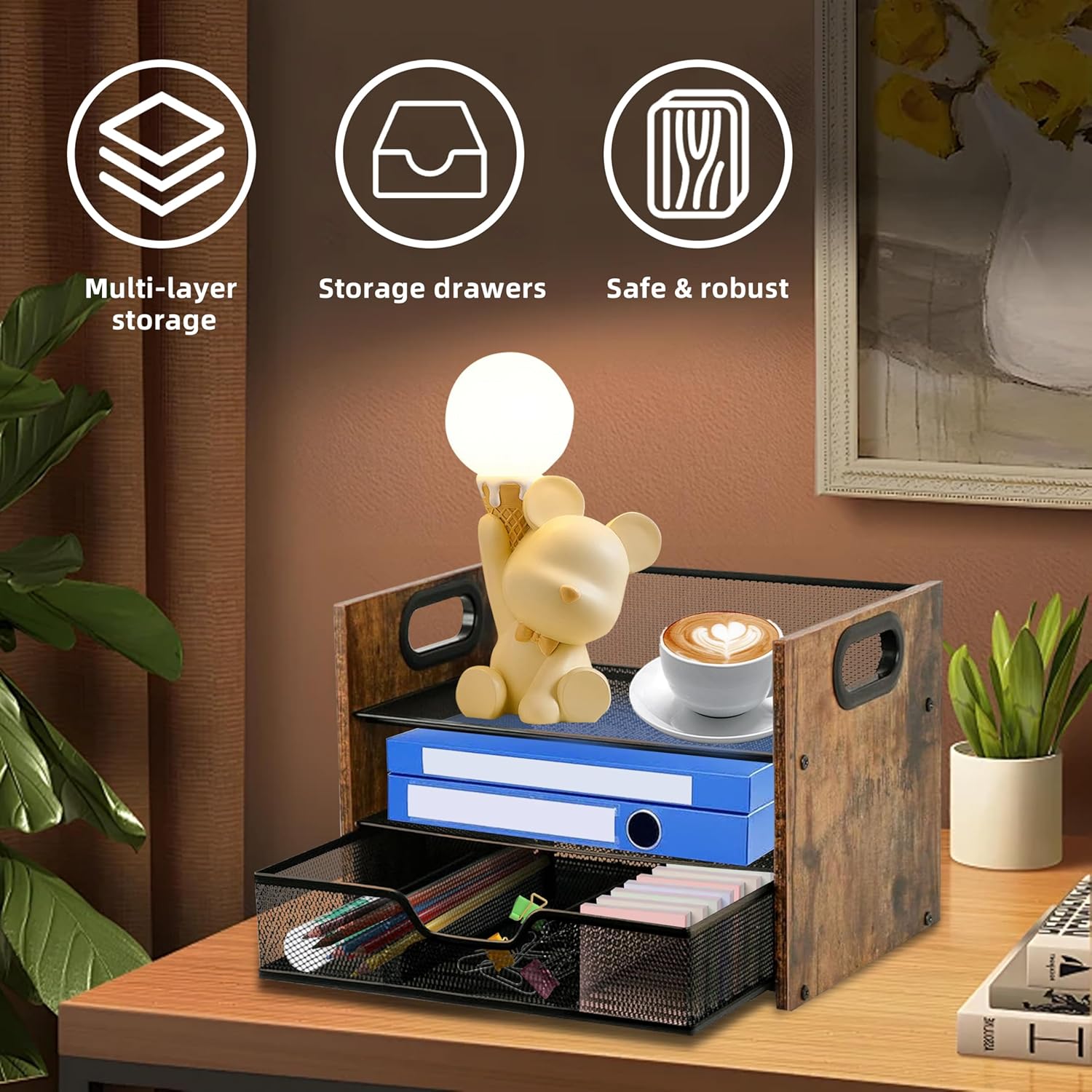 Wood Desk Organizer - 3-Tier Desktop File Organizer with Drawer, Wooden Paper Tray, Office Desk Organzier and Accessories for Papers, Mail, Notebooks, Stationery