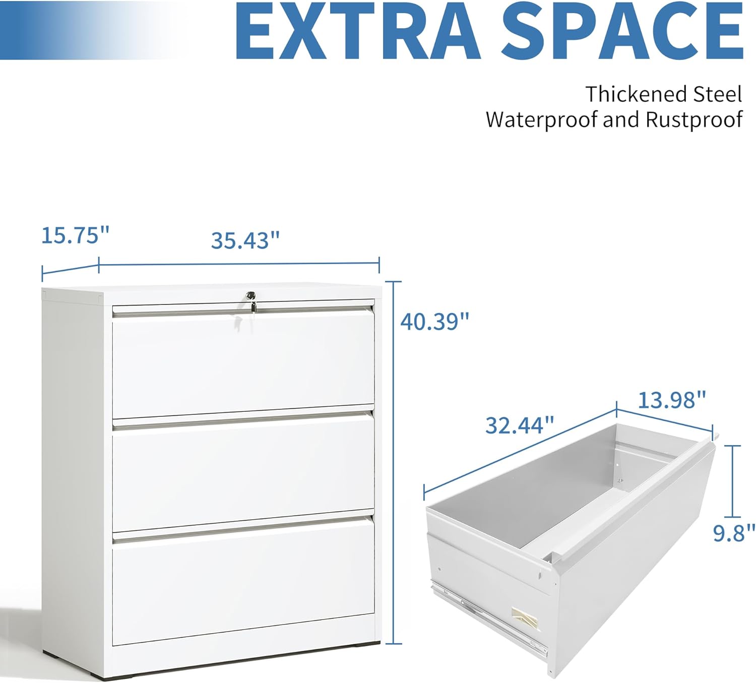 - ăSturdy and Functională The 3 drawer file cabinet size:D15.75"*W35.43"*H52.28", drawer size:D13.98"*W32.44"*H9.8", each drawer can support up to 55 lbs. The lateral file cabinet is equipped with premium full-extension metal drawer slides, allowing for smooth and easy access even when fully loaded, making organization a breeze.