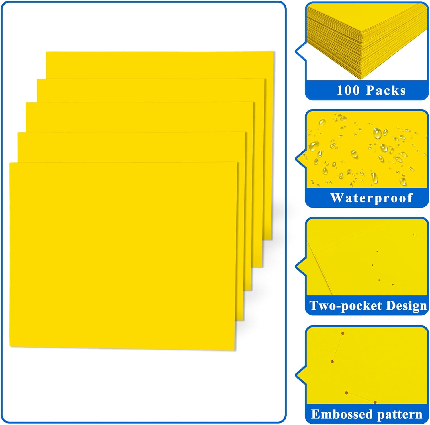 - Package Includes:50 packs yellow file folders with 2 pockets and business card slot,100 plus Sheet Capacity,enough use for you,perfect for school,paperwork,office,business.