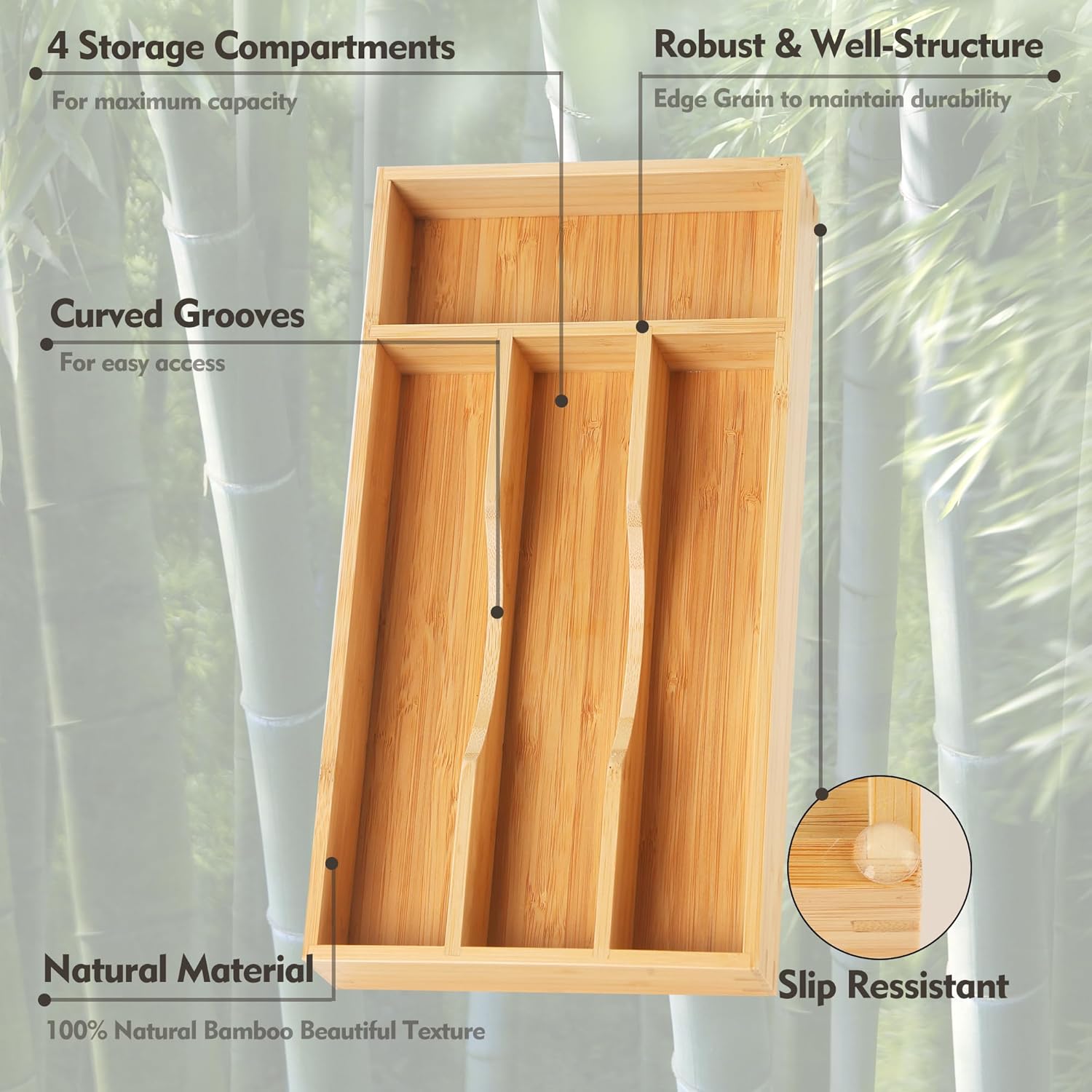 - ăSturdy and Well-madeăOur narrow silverware tray for drawer (even the base) is made of natural edge grain bamboo with the age of over 4 years, which makes the silverware organizer durable enough for long time use. Even the knife won't leave scratch on it. Unlike the plastic and metal drawer organizer, our silverware tray more classic and natural, the color and texture of the kitchen drawer organizer is natural and even.
