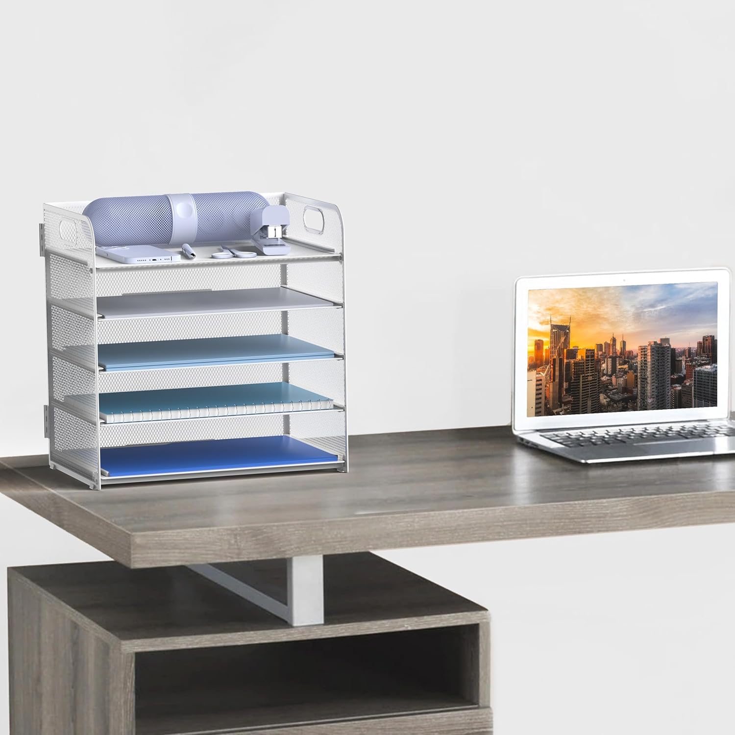 Letter Tray Paper Organizer 5-Tier Desk Organizer File Organizer Paper Holder with Handle, Metal Desktop Document Shelf Tray Office Classroom Organization - White