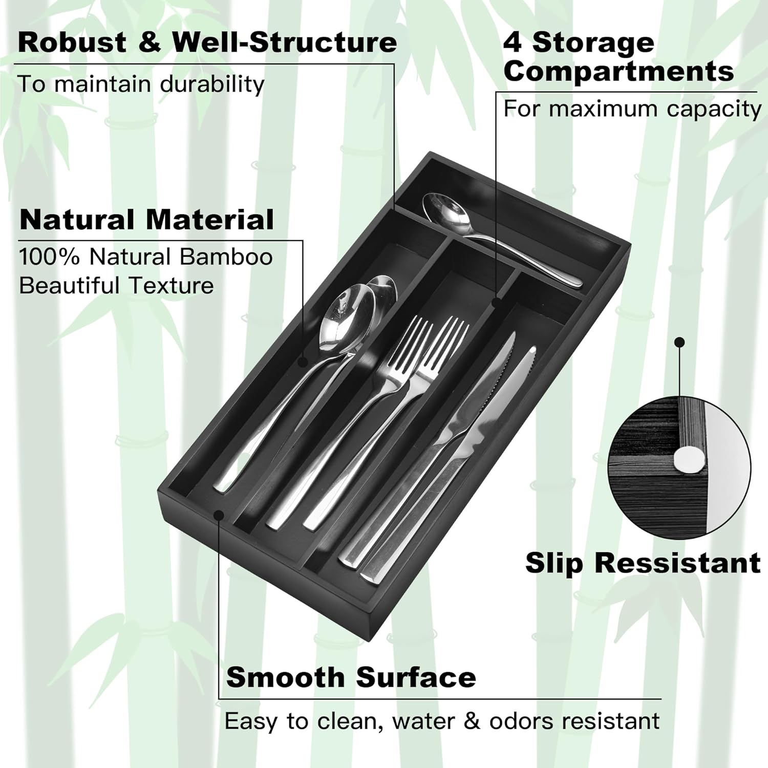 Silverware Organizer Small Bamboo Kitchen Drawer Organizer Utensil Organizer Silverware Holder Cutlery Organizer in drawer Flatware Organizer Tray (Black 4 Slots)