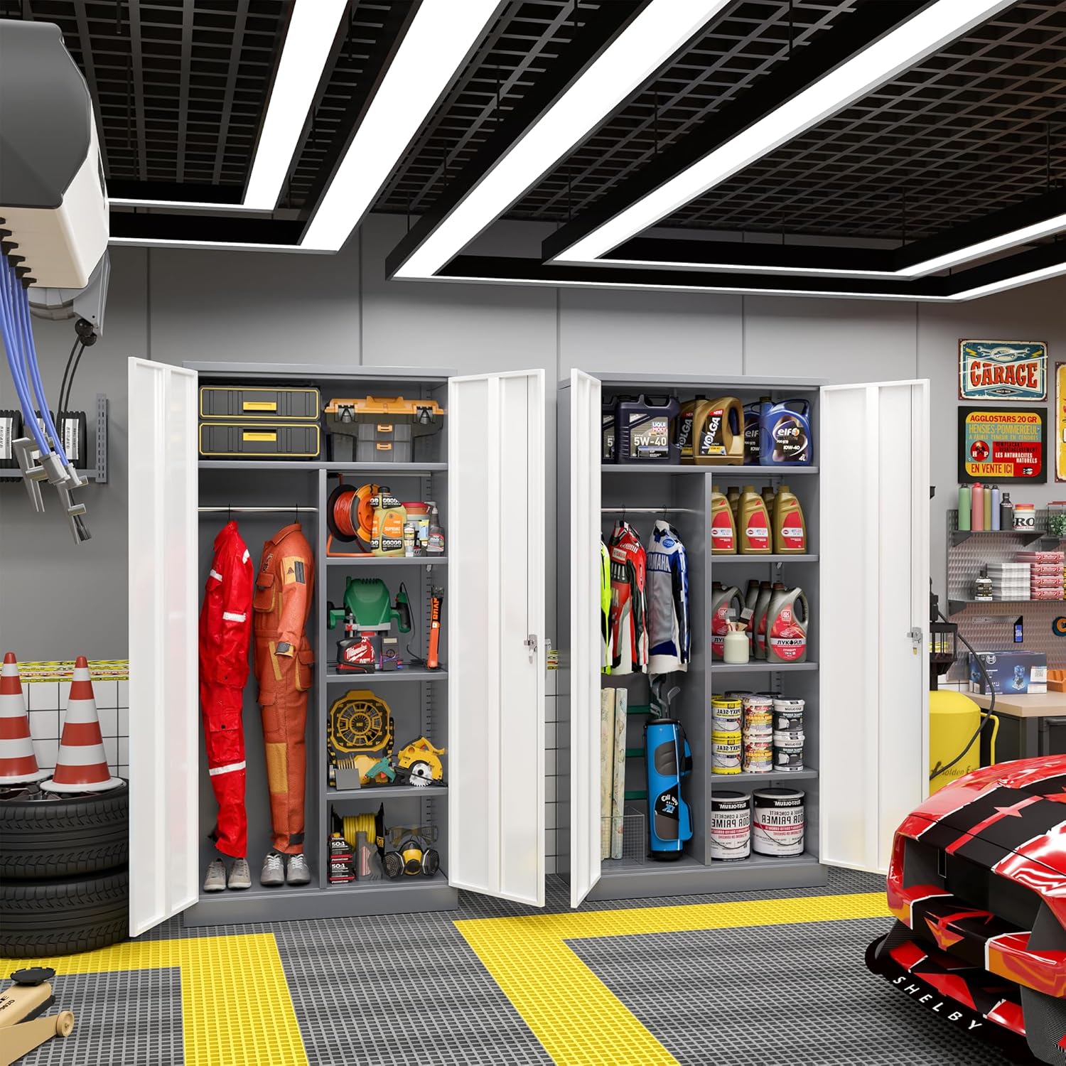 Greenvelly Metal Storage Cabinet with 2 Doors, 72” Steel Storage Wardrobe Cabinet, Employees Locker Closet Clothing Coat Steel Wardrobe Cabinet with Hanging Rod for Garage, Home Office (Grey White)