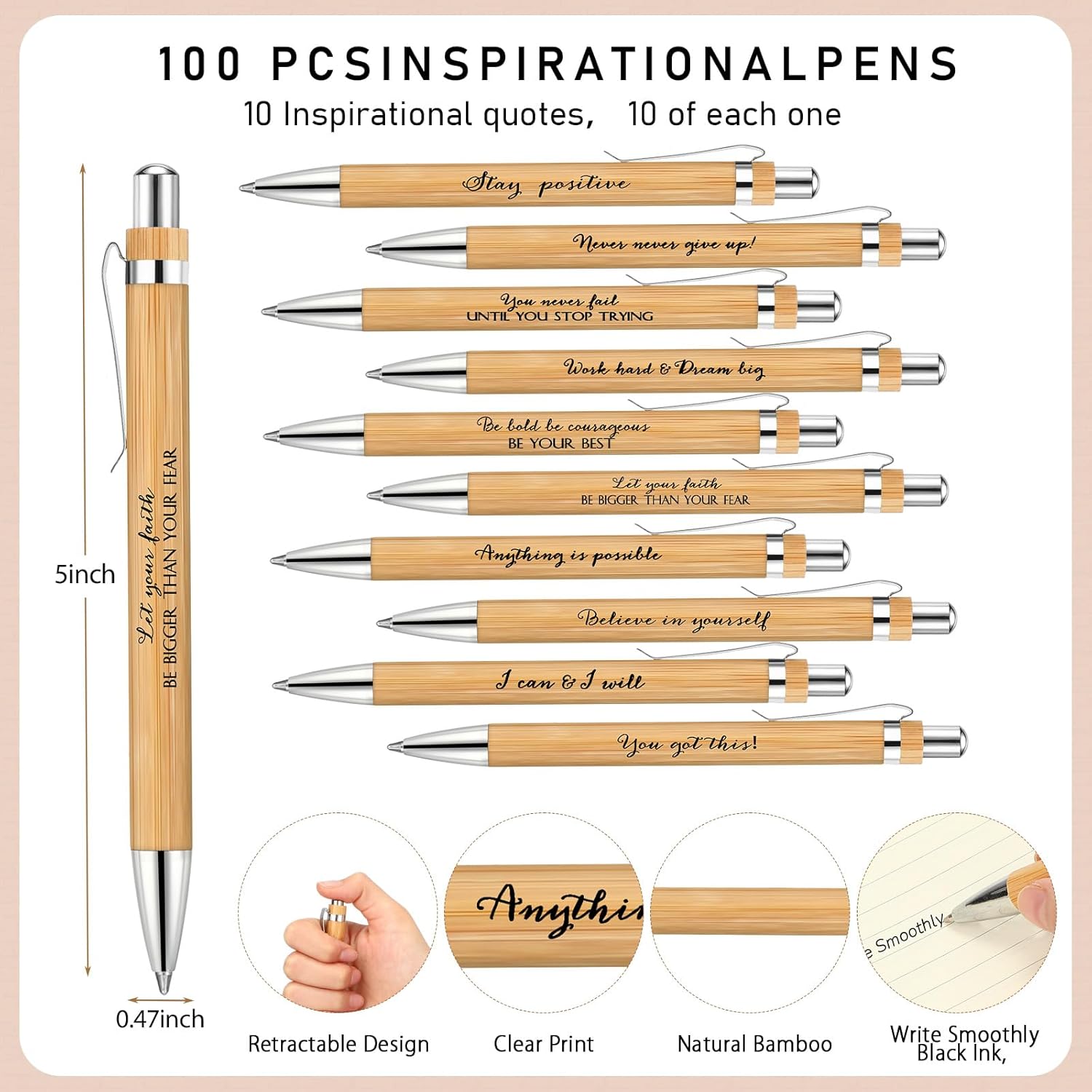 - Appreciation Gifts Bulk: you will receive 100 pcs of motivational spiral notebooks in 10 designs, 10 pcs for each design, each equipped with sticky notes and index tabs, and 100 pcs of retractable bamboo pens in 10 designs, 10 pcs for each design, enough quantity to satisfy your daily use and sharing needs