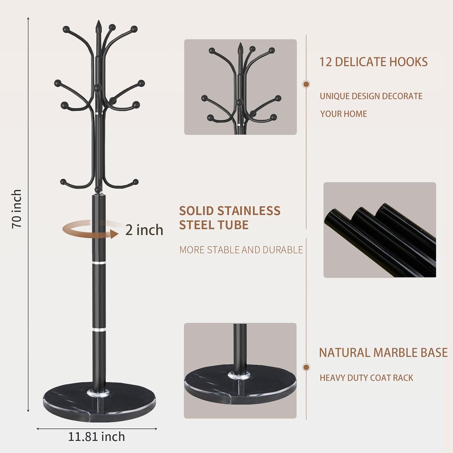 Modern Metal Coat Rack Stand, Coat Rack Freestanding with Natural Marble Base, Sturdy Heavy Duty Coat Racks with 12 Hooks, Black Coat Hall Tree Stand for Entryway, Office (12 HOOKS-Black)