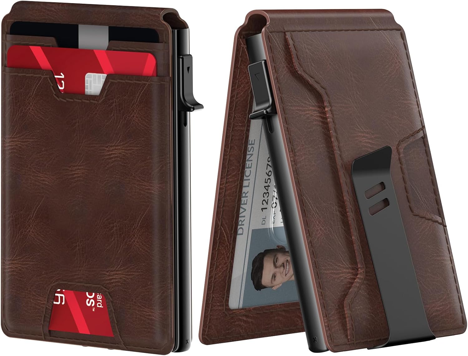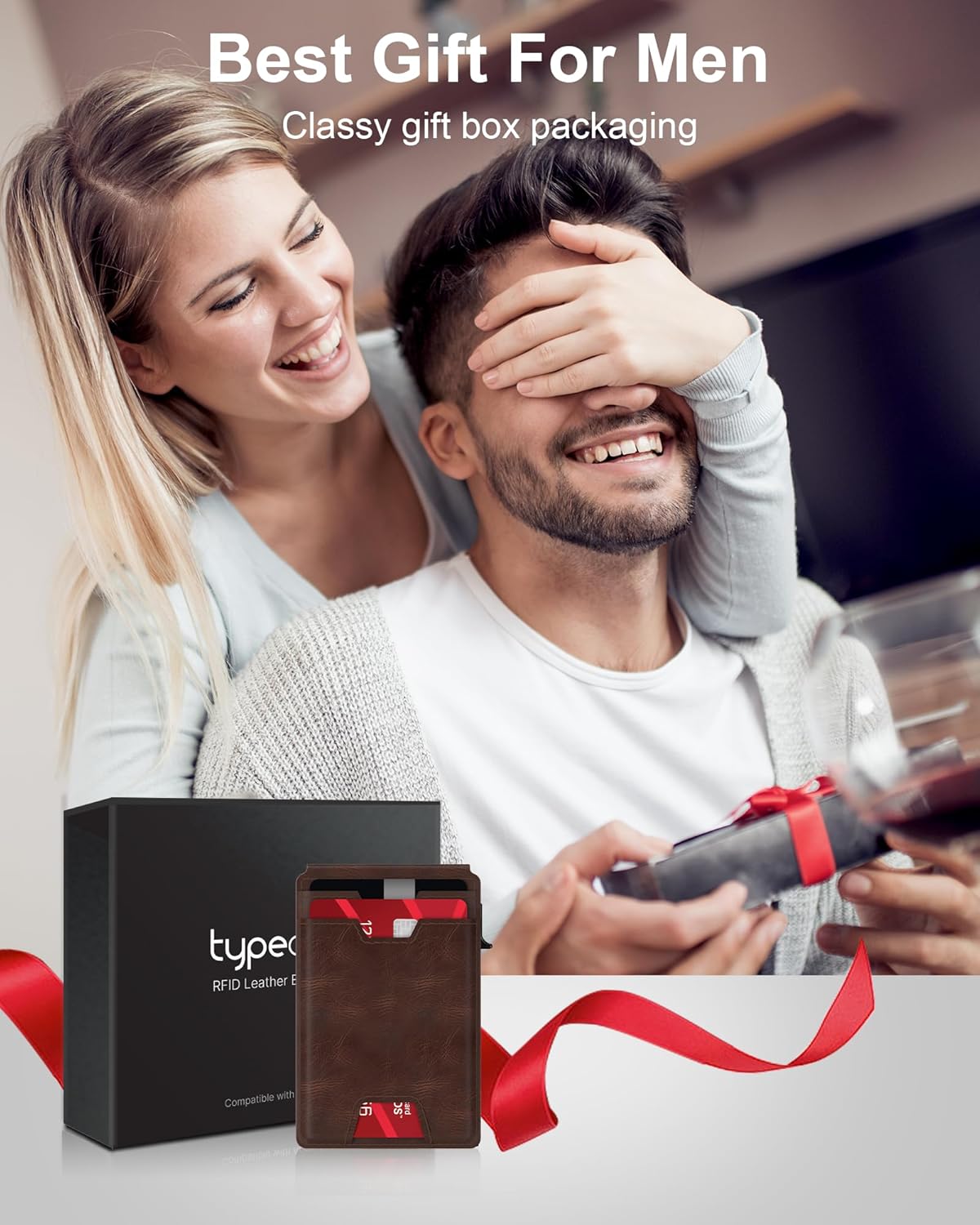 typecase Mens Wallet Card Holder: Pop Up Card Case, Genuine Leather, Smart, RFID Blocking, Slim, Minimalist, Thin, Front Pocket - 9-13 Card Capacitiy | ID Window | Money Clip (Brown)