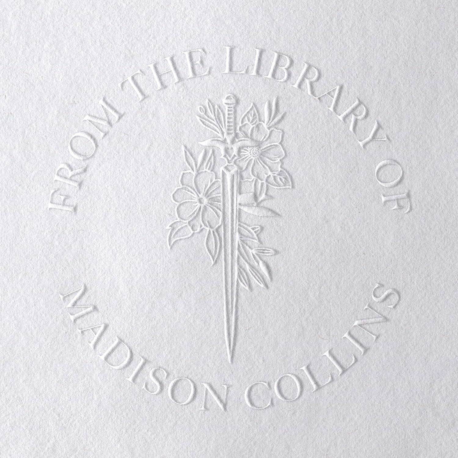 Personalized Book Embosser or Stamp Custom Round Library Embosser Teacher Library Book Stamp, Ex Libris Stamp, Gift for Book Lover | Wooden or Self Inking Stamp or Embosser (Floral Sword)