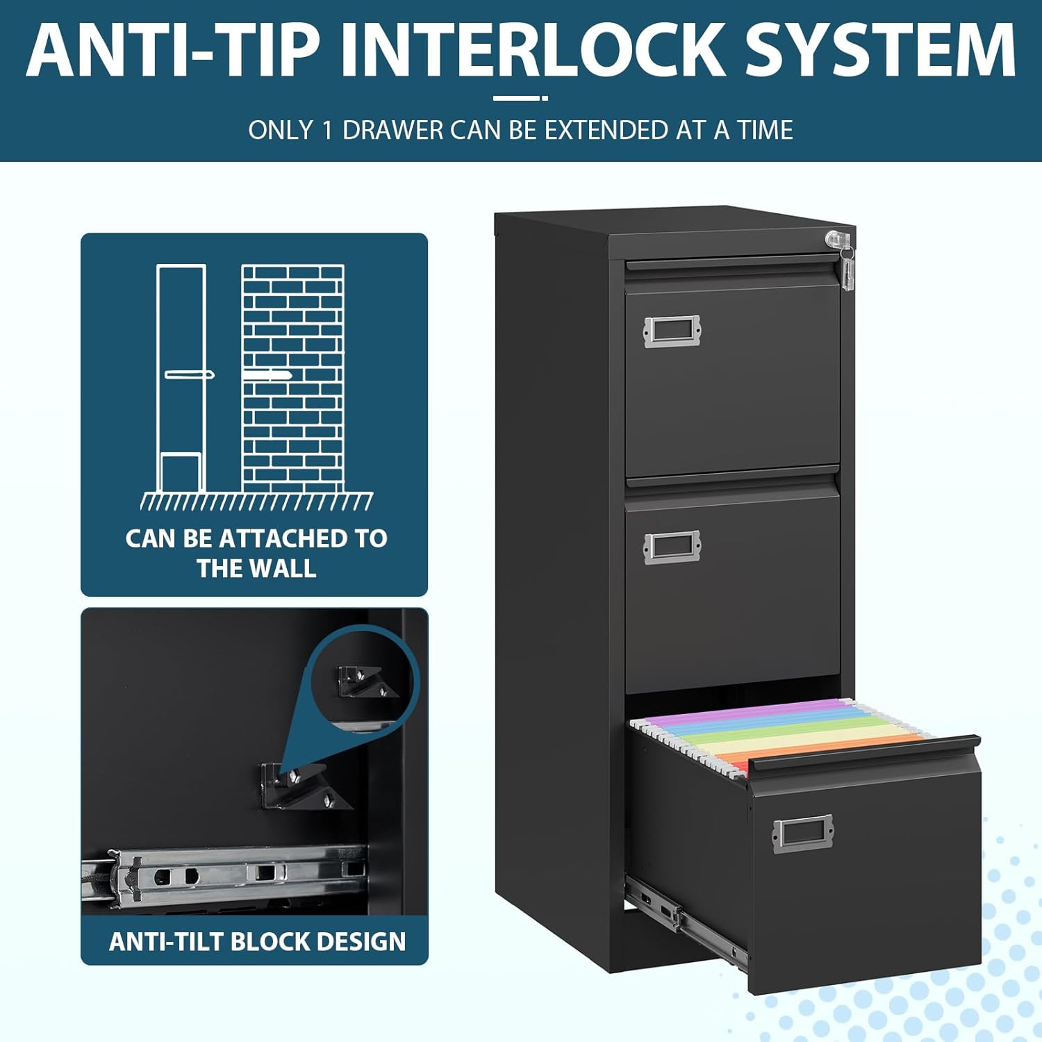 - 【Metal File Cabinet】This 3 drawer file cabinet is made of cold-rolling steel. A durable steel construction supports dependable lasting use. Each drawer is equipped with hith quality & full extention glide rails.