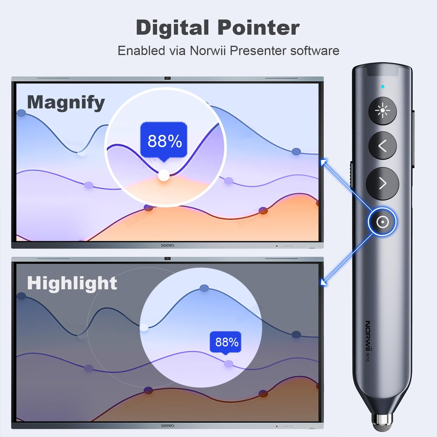 Norwii N10 Bluetooth Presentation Remote with Stylus Pen for Touch Screen, Advanced Digital Highlighting Presenter Clicker, 50M Range Metal Shell