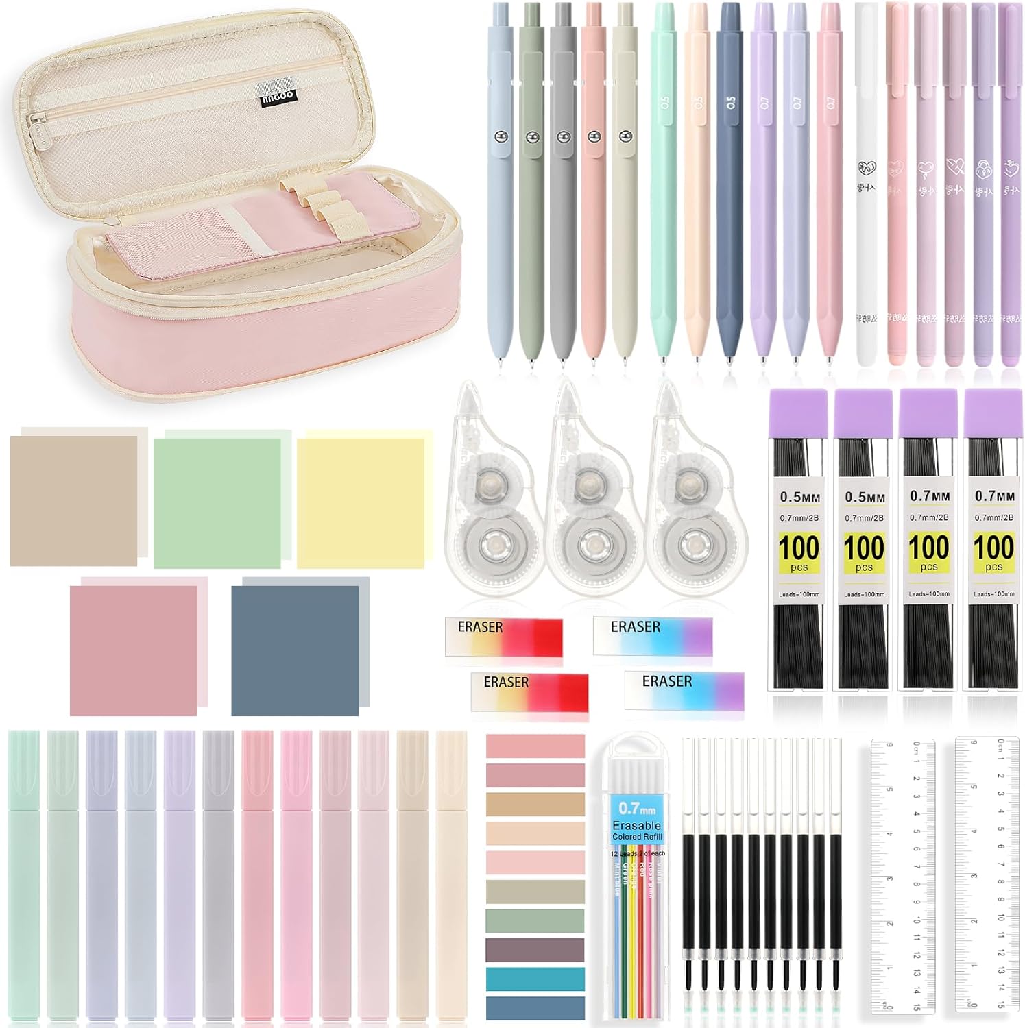 MoKo 60Pcs Aesthetic School Supplies with Cute Pencil Case,12 Pastel Highlighters,5 Black Ink Gel Pens,6 Mechanical Pencil Set 0.5 & 0.7 mm for Students Stationary College Essentials