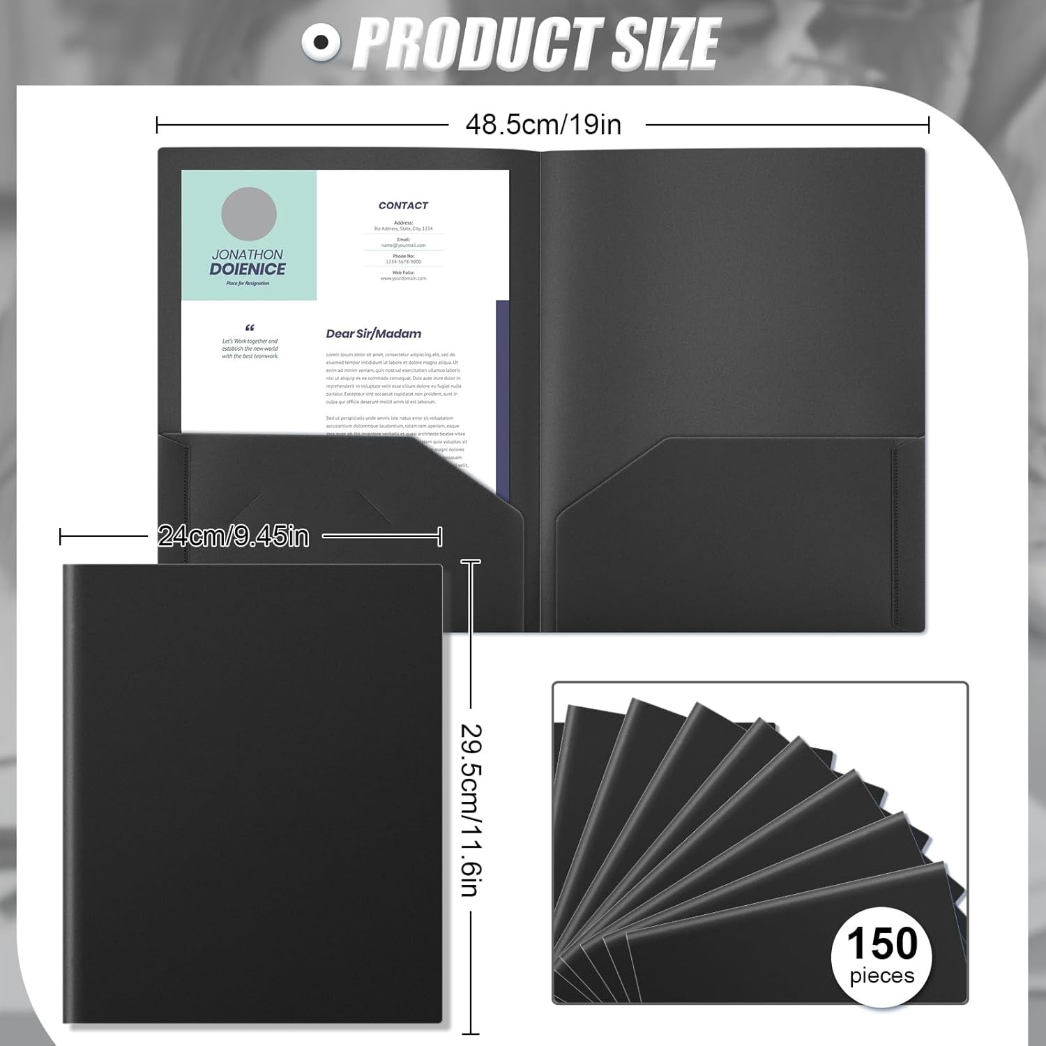 Gueevin 150 Pcs Plastic Folders with Pockets, Two Pocket Folder Fit 8.5 x 11 Inch Letter Size Paper, Heavy Duty School Folders Business Card Holder for Home Office School Bussiness (Black)