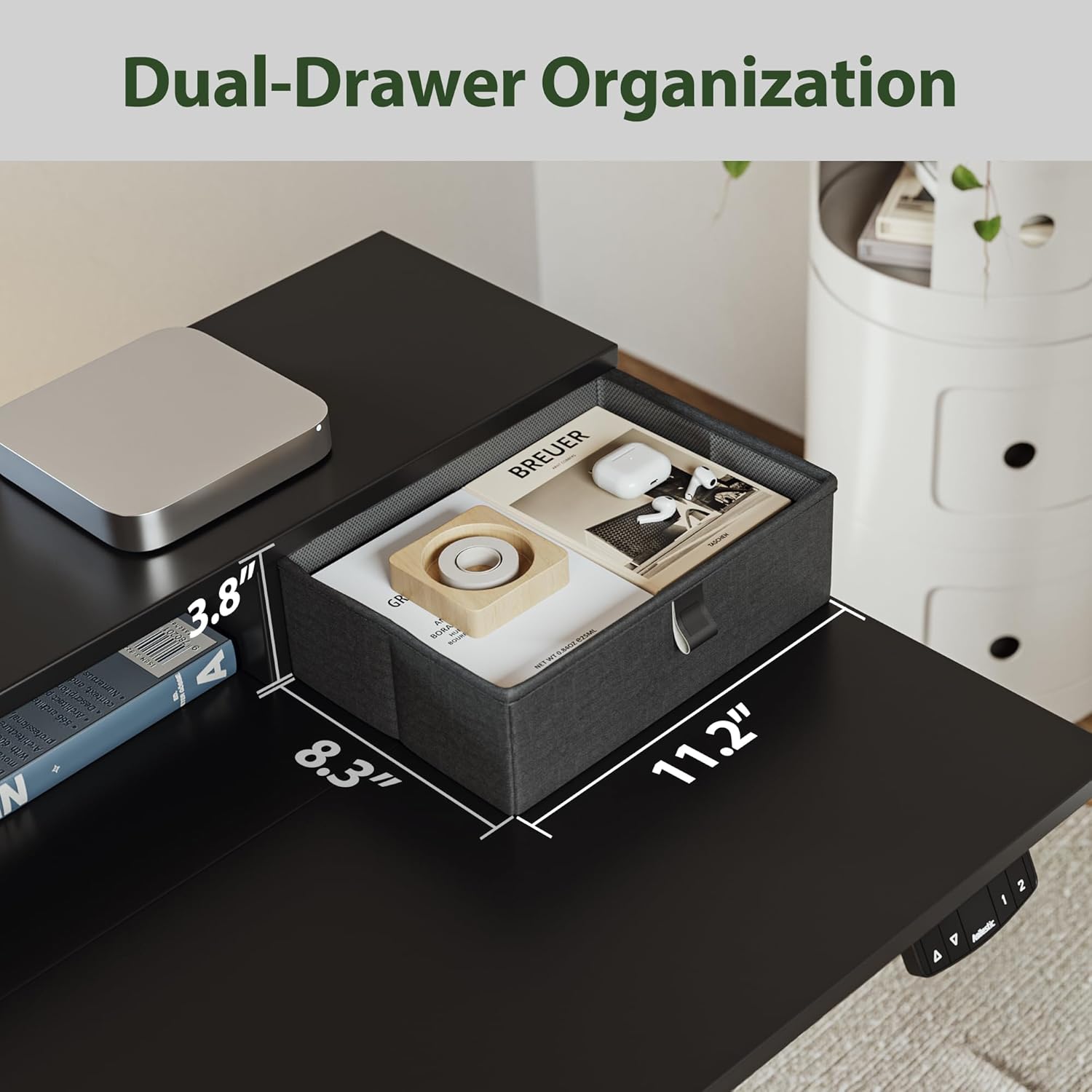 - 2 Fabric Drawers: Keep your workspace tidy with two fabric drawers, perfect for organizing your essentials. Made from low-VOC materials, the tabletop meets federal and state air quality standards.