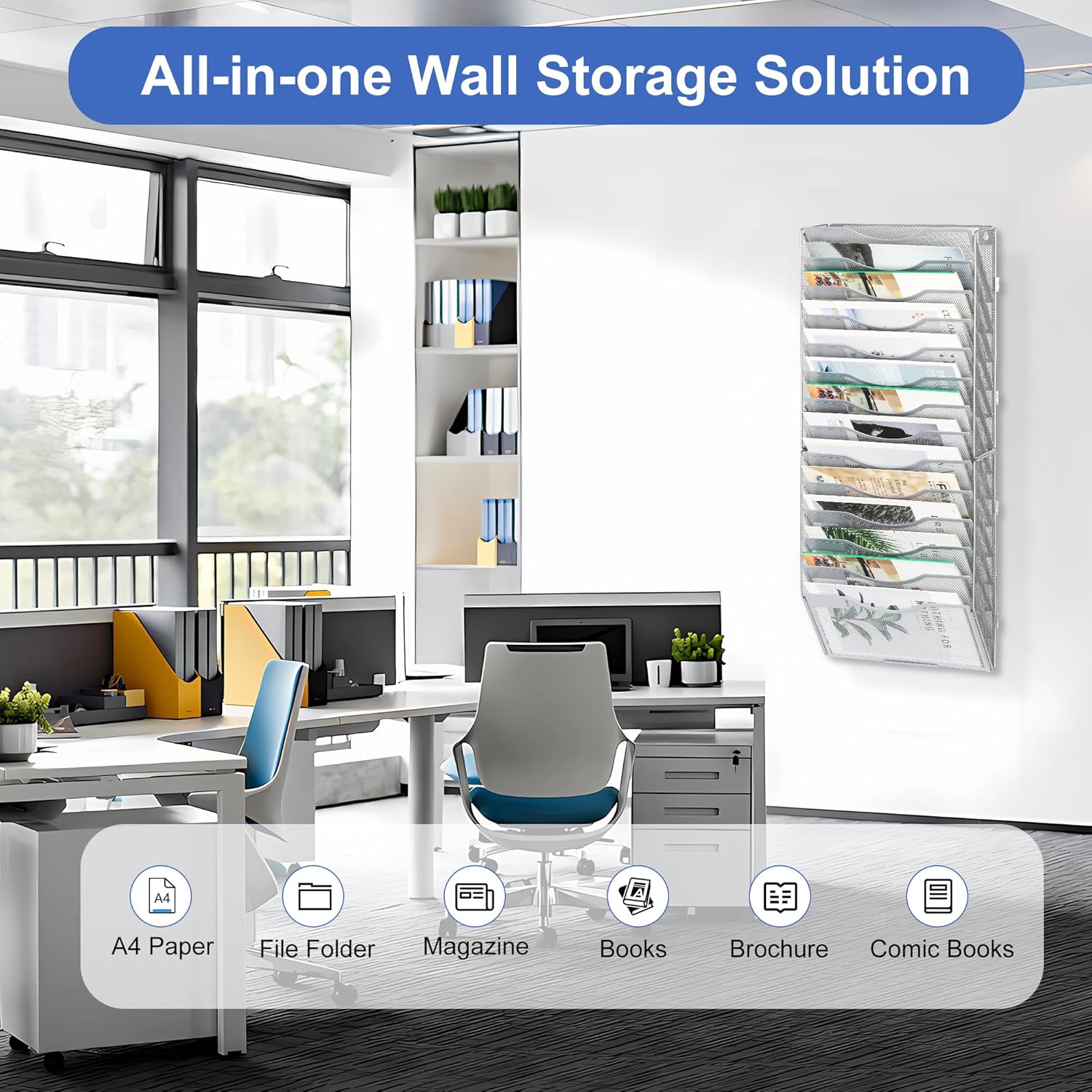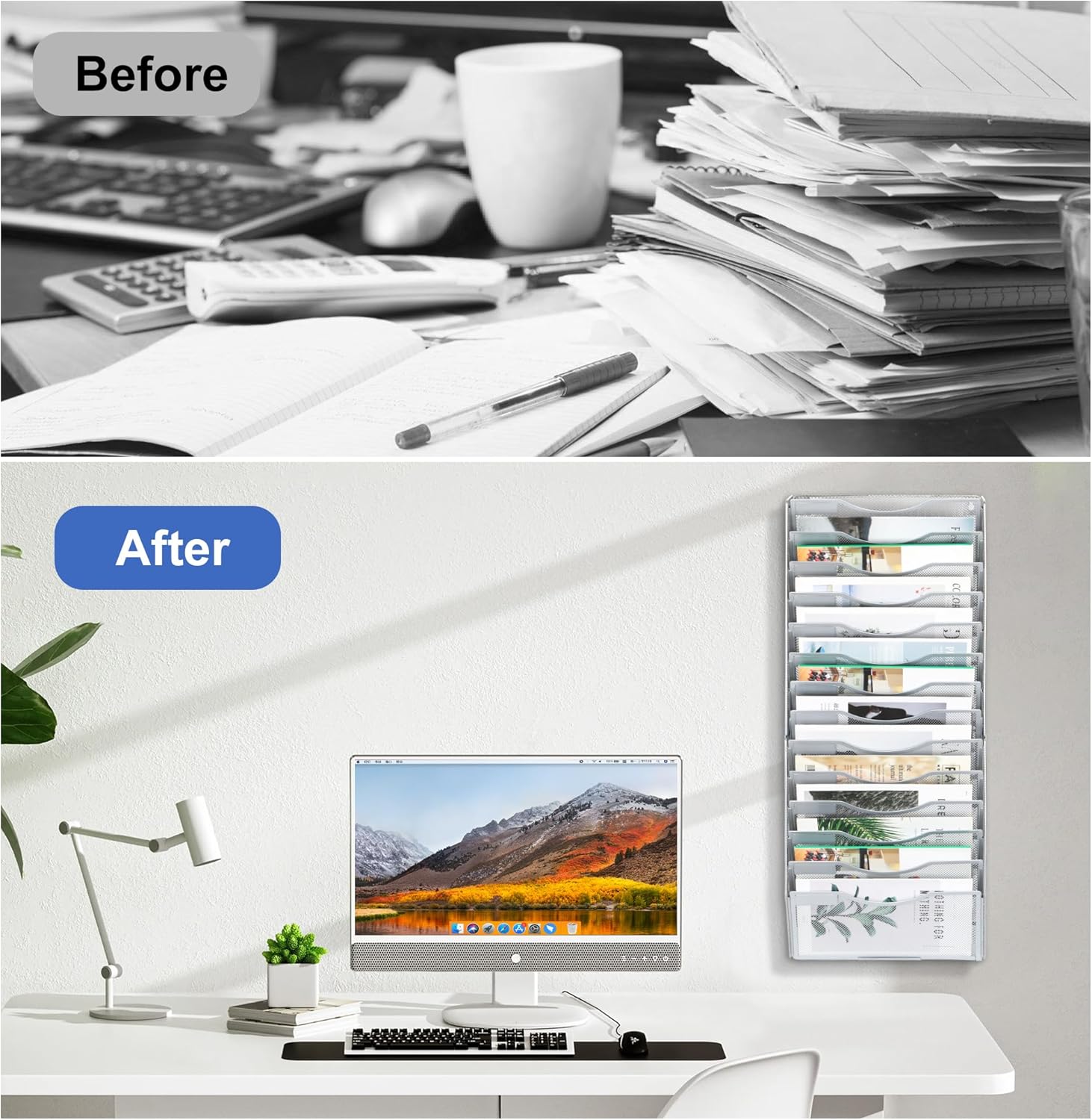 - Space Saving: 14 tier metal wall file organizer comes with mounting screws that can be easily mounted on the wall. Use your home or office space more efficiently by keeping your files organized and off the desk and workspace.