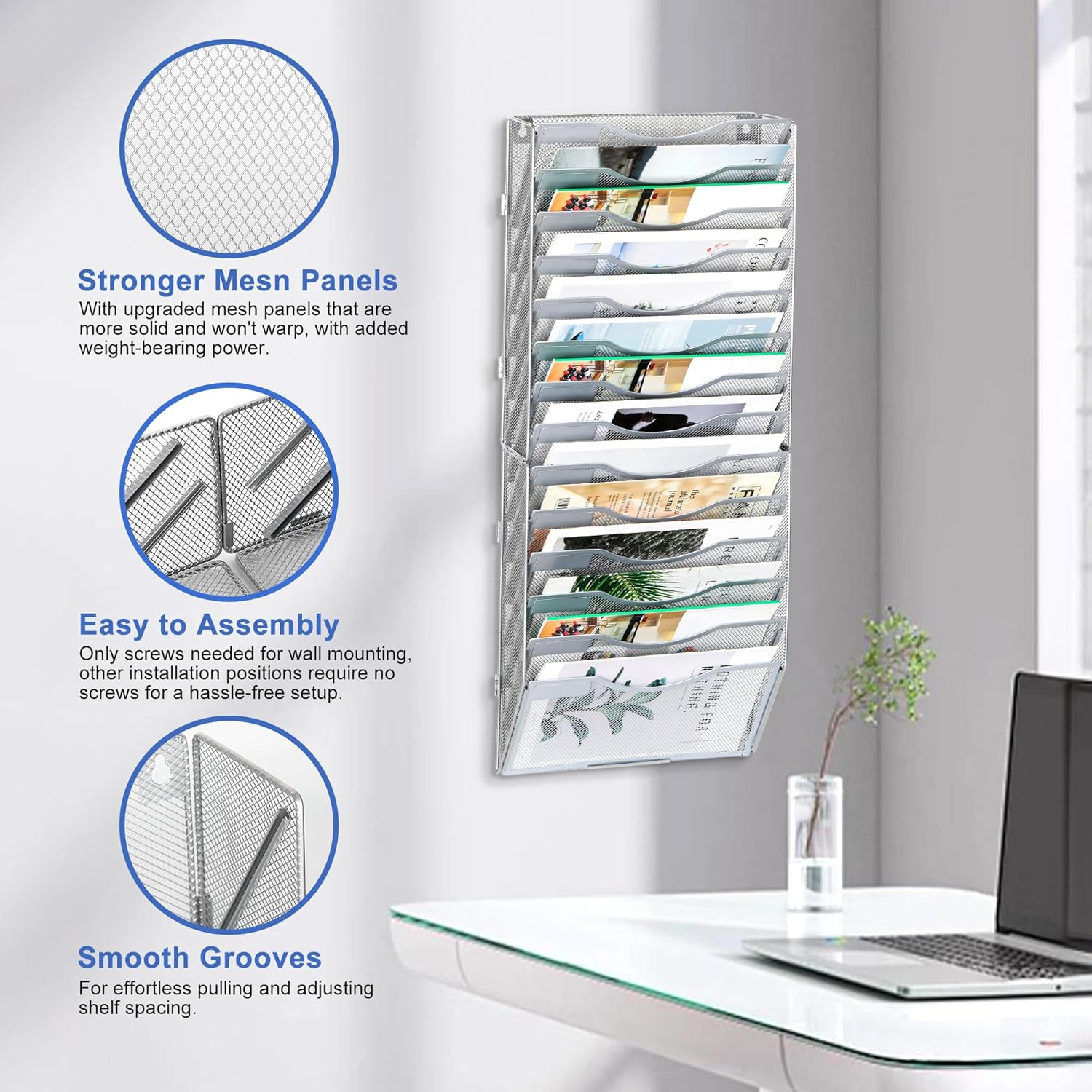 - Easy to Use: This hanging file organizer requires zero tools for assembly. Easy to mounts on walls, cubicles, partitions.