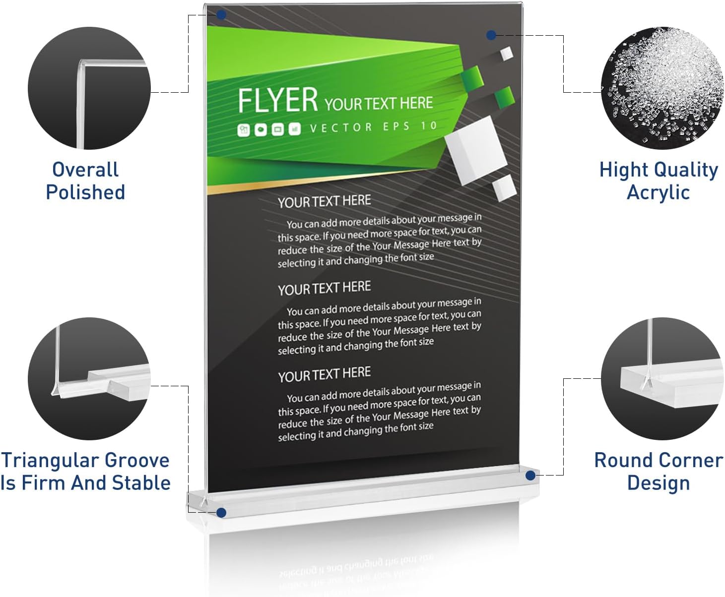 - Double-Sided display: Acrylis sign holder is double-sided display, allowing you to display two flyer, menu or phtots at the same time. All the edges of the sign holder are disigned with rounded corner, you can easy to change the contents and not hurting your hands.
