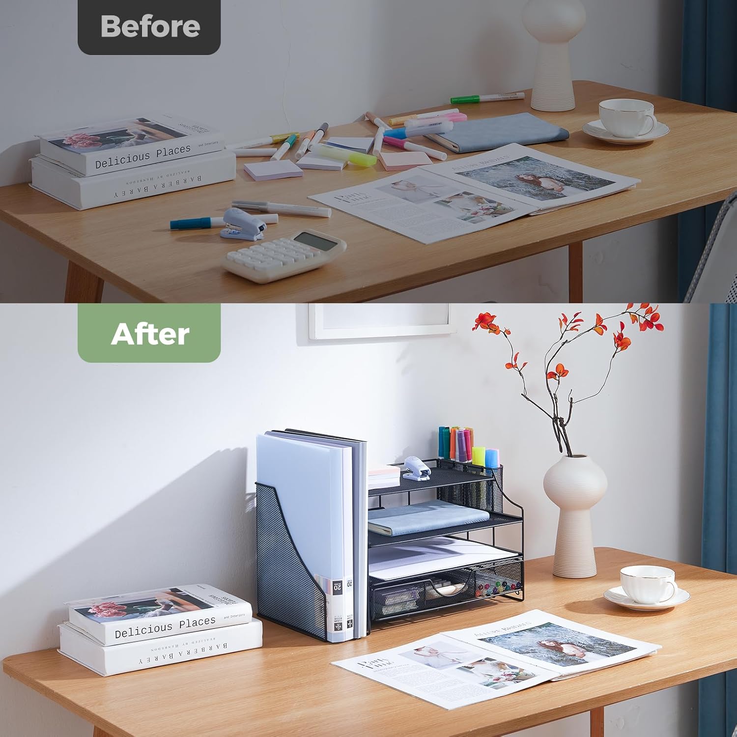 - Multi-Functional Desk Organizer: Get your work area in order with the desk organizers and accessories! Featuring 3 trays, a vertical file organizer, 2 hanging pen holders and a sliding drawer, which can help you quickly identify the storage content of each compartment- A4 sized documents, pens, or other office items