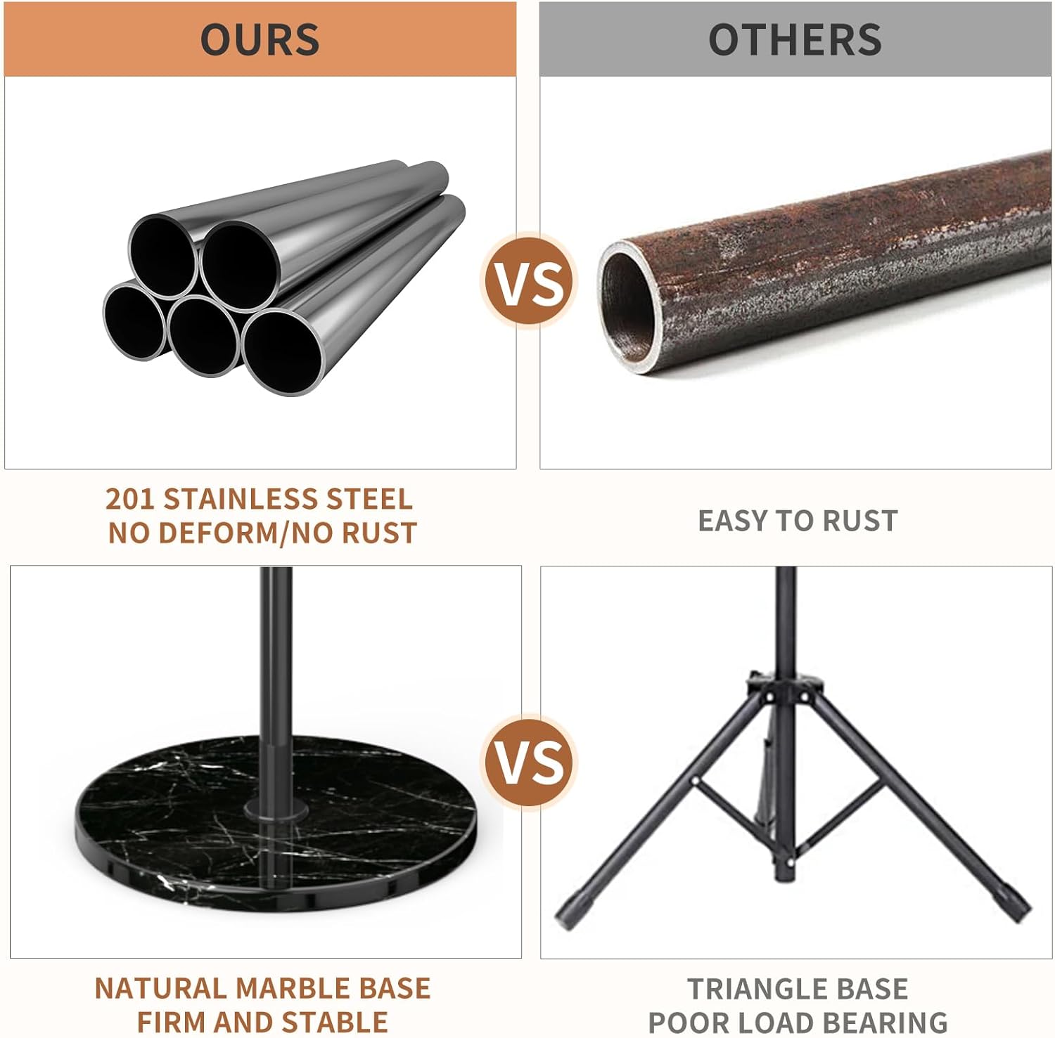 - STURDY STAINLESS STEEL RACK FRAME: The main rod and hooks of this coat rack stand are all made of stainless steel, which has stronger load-bearing capacity, strong and stable structure, and can effectively prevent deformation