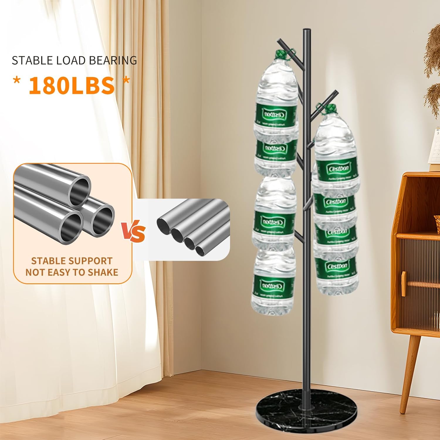 - 100% NATURAL MARBLE BASE:This coat rack freestanding is made of 100% natural marble. Carefully selected natural marble, each piece has a unique vein carved by nature (not a quality issue). The base is 11.81 inch in diameter and 1.18inch in thickness, very solid and able to support up to 180LBS, hang heavy winter coats and briefcases very firmly without wobbling