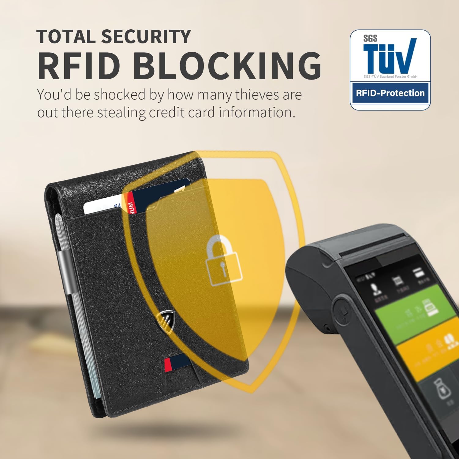 - RFID Blocking Protection - This rfid wallet for men is tested by an independent German quality control institute, specifically to block 13.56 MHz or higher RFID signals and protect against data theft by RFID scanners