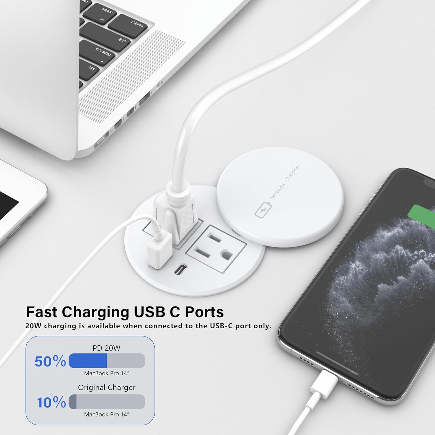 Recessed Power Grommet 3-inch Hole, 15W Wireless Charger, 20W USB C Fast Charging Station,2 AC Plug, Flush Mount Countertop Outlet, Workspace Essential Desk Hole Cover for Cables White
