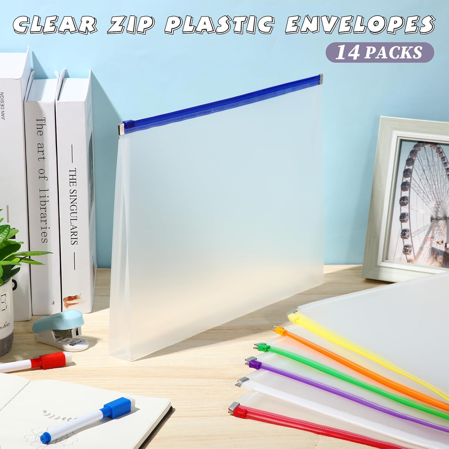 Yexiya 14 Pcs Back to School Clear Plastic Zip Envelope A4 Zipper Document Folder 13 x 9.7In File Folder Expanding Envelope Pouch for Paper Pencil Storage Office Supplies (Bright Colors)