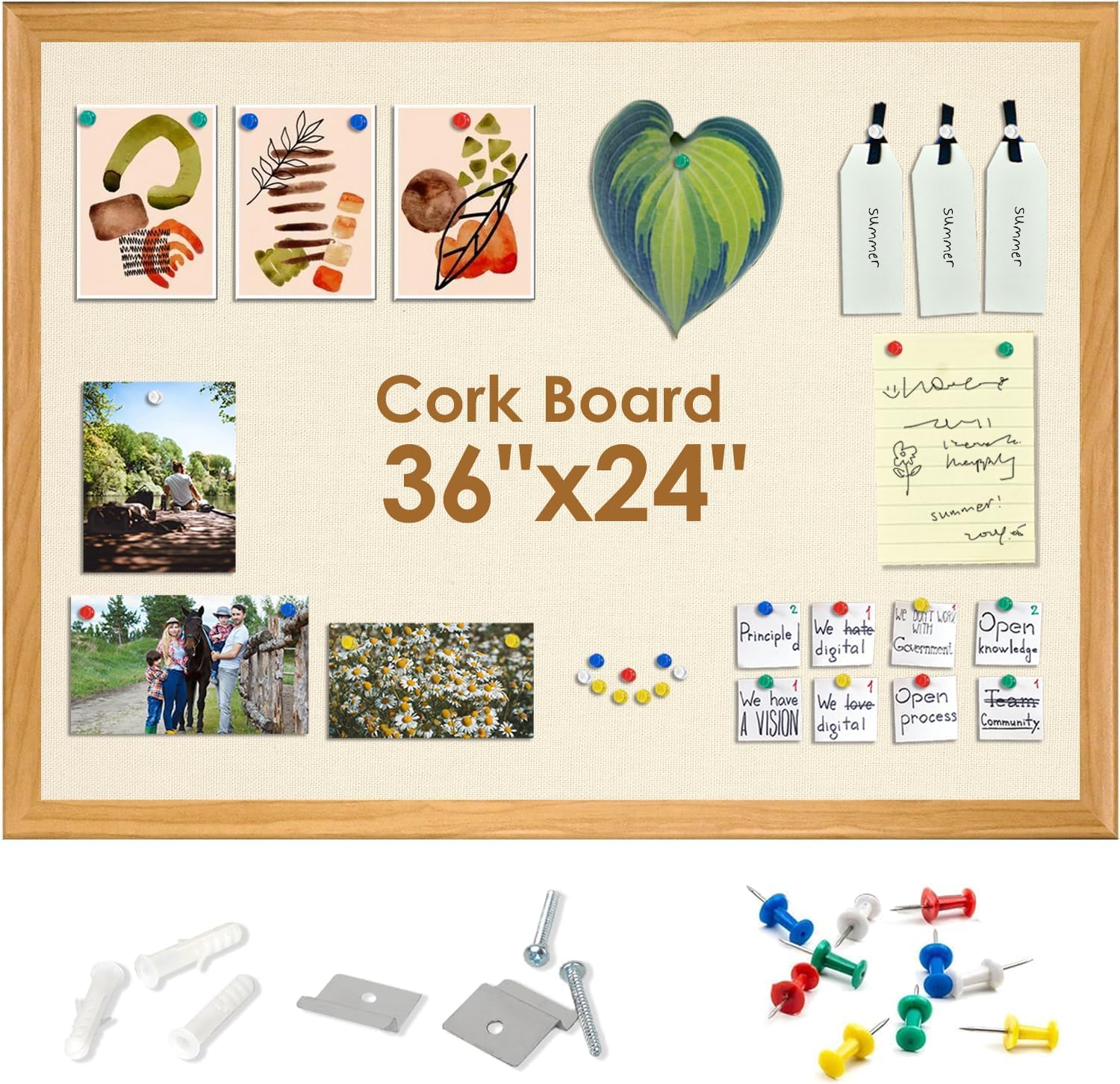 SHANTRA 36 x 24 Inch Bulletin Board with Beige Fabric, Wood Framed Canvas Cork Board, Corkboard for Walls with 10 Pins, Decorative Vision Board, Wall Mounted Notice Board for Home, Office, School