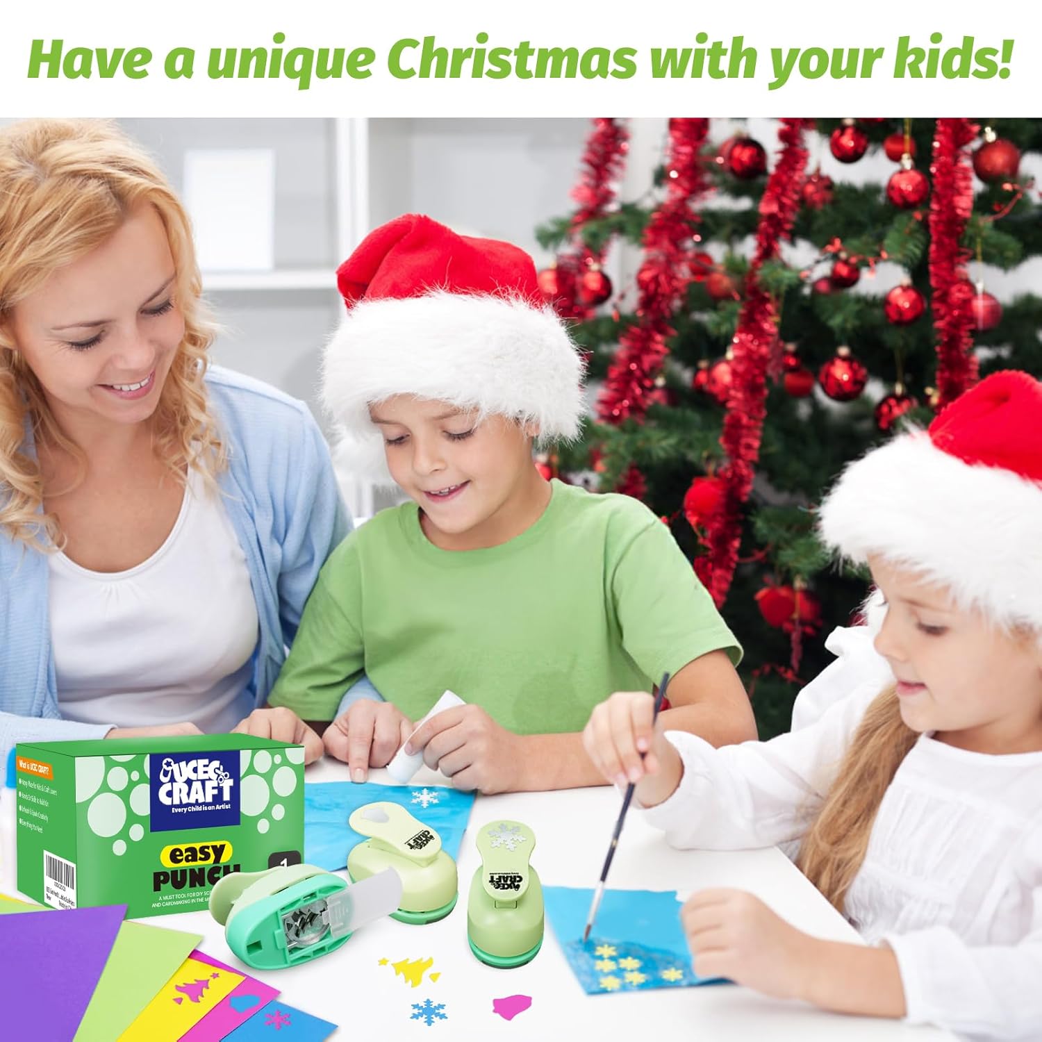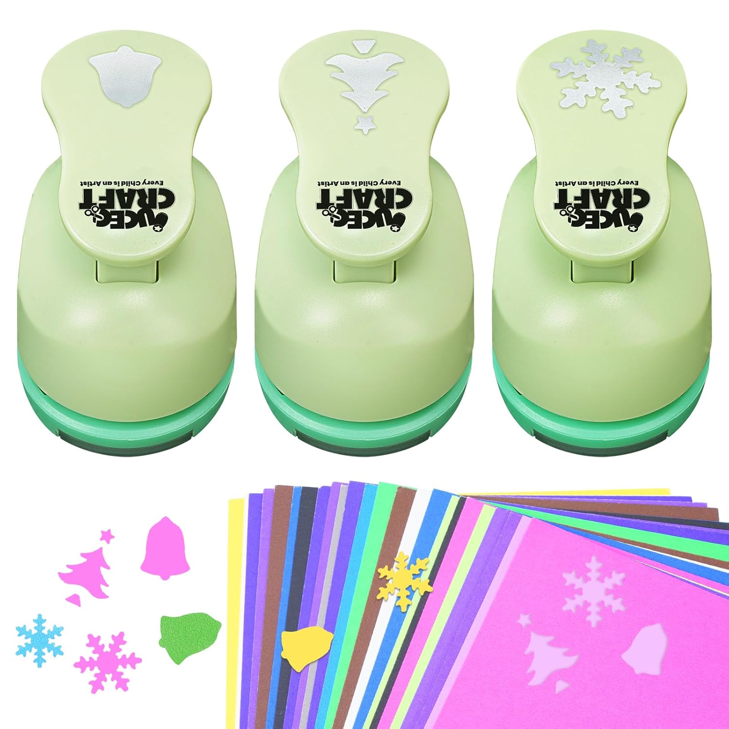 - Scrapbook Punches Quantity --- Comes with 3 pieces craft paper punchers in 6 different styles and 30 pieces colorful craft paper, 3 shapes including christmas, snowflakes and bells shape, comfortable to use and easily get a clear shape from card-stock, a great craft supplies for kids.