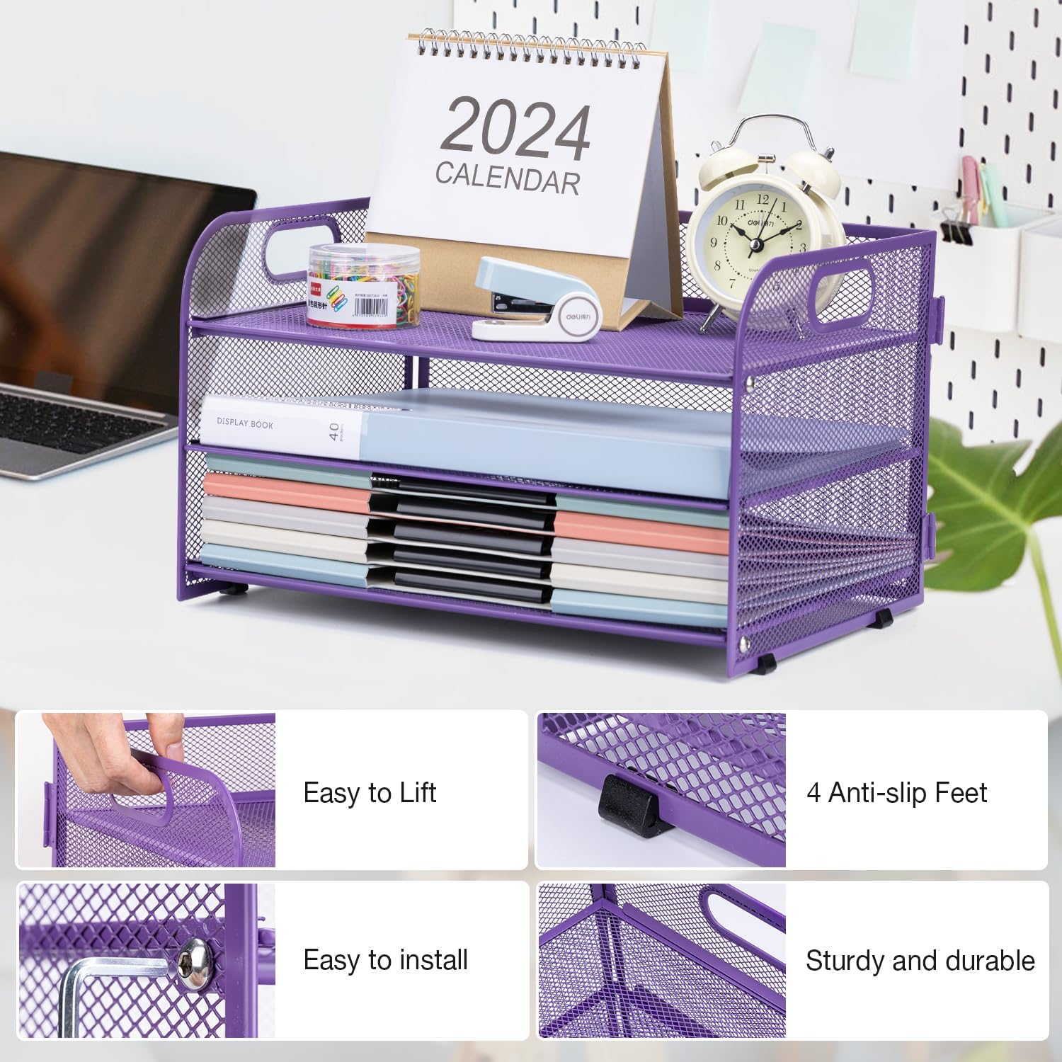 3-Tier Letter Tray Paper Organizer with Handle,Compact Mesh Desk File Organizer for Home Office Supplies Desktop Accessories,Purple
