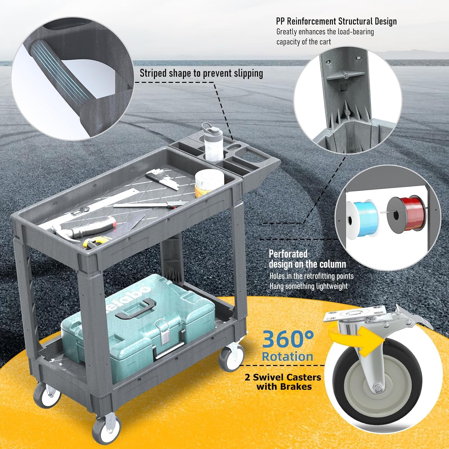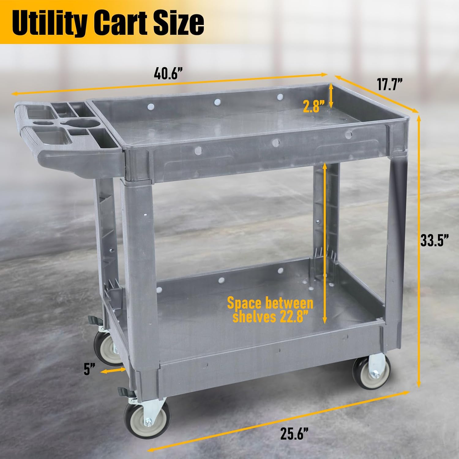 Utility Rolling Tool Cart, 40 x 17-Inch Plastic Rolling Carts, Huge Storage W/Deep 2-Shelf Heavy Duty Service Cart with Wheels, 550 lbs Capacity Organizer for Garage, Warehouse, Workshop