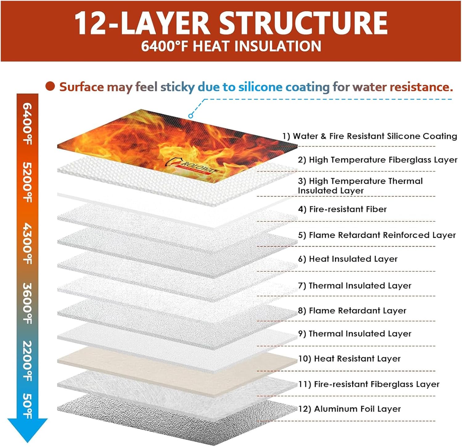 - [ADVANCED 12-LAYER FIRE PROTECTION]: Our fire proof bag for documents features an Enhanced 12-layer Structure, comprising a Silicone Coating Layer, Fireproof Fiberglass (x3), Flame Retardant Layer (x2), Thermal Insulation Layer (x5), and an Aluminum Foil Layer. It provides critical time to retrieve your items in the event of a fire. NOTE: The silicone-coated fiberglass surface may feel STICKY. If you are sensitive to STICKINESS, this product may not be suitable for you