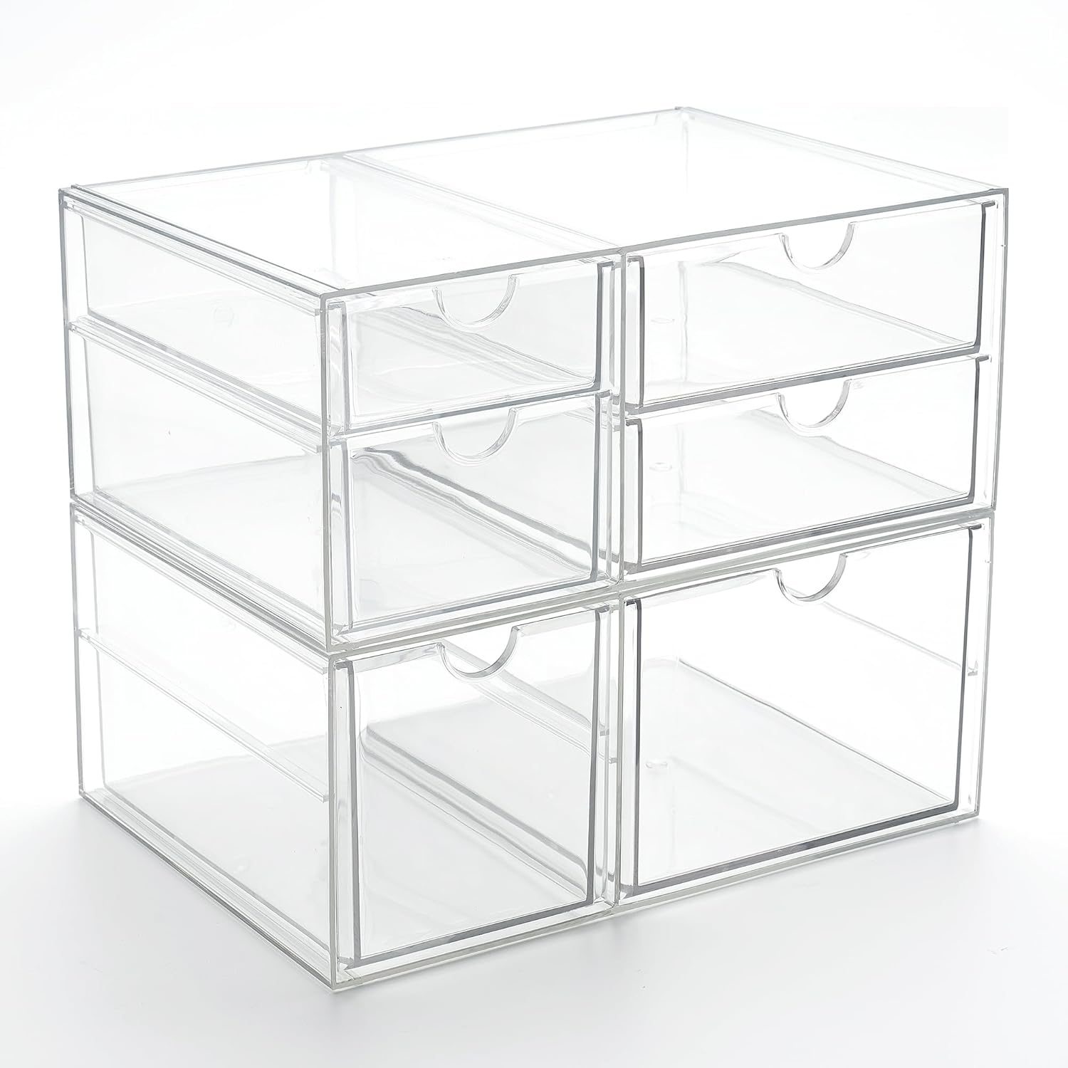 Prsildan Acrylic Drawer Makeup Organizer with 6 Drawers, Set of 2 Office Desk Organizers Accessories, Clear Stackable Storage Drawers for Vanity, Craft, Not for Baby Bottle (Largest Drawer 4" Tall)