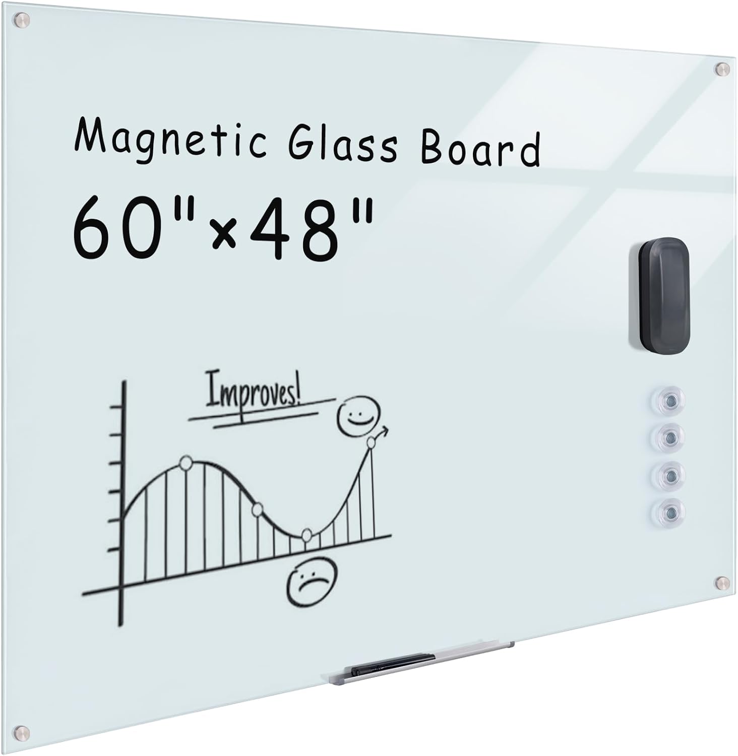 Magnetic Glass Whiteboard,60"x48" Wall Mounted Frameless Dry Erase Board for Office, Home & School White