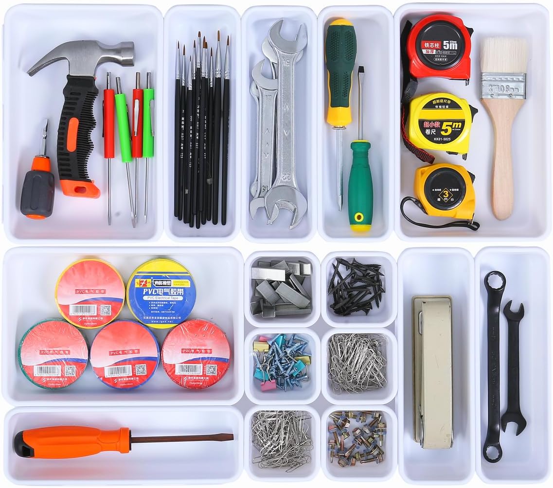 - 【MULTI-PURPOSE STORAGE】15 Pcs customizable drawer bins include 3 large,6 medium and 6 small trays.It’s easy to find a configuration that works for your drawers or desktop.You could use them in bathroom,office,dorm room and more.