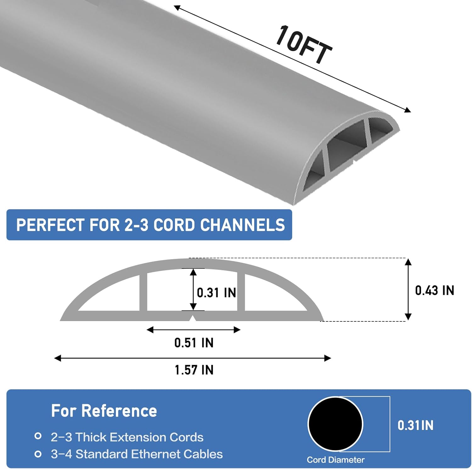 Floor Cord Cover Self Adhesive Cord Hider Floor Extension Cord Covers for Floor Power Cord Protector Cable Management Prevent Cable Trips Cable Cavity 0.51" W x 0.31" H (Grey, 10Ft)