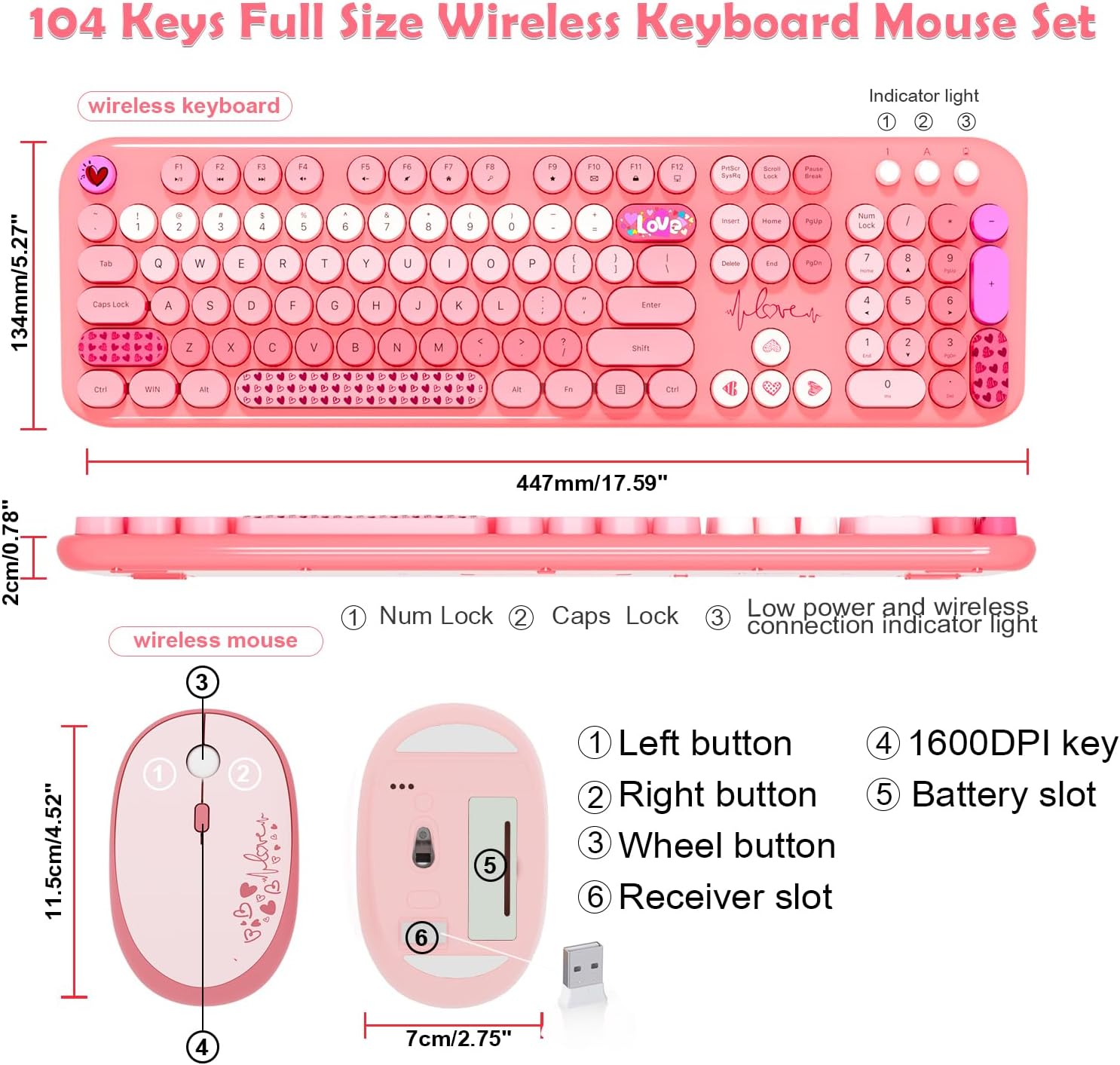 - 2.4G wireless connection,No Lag: Enjoy a seamless wireless experience with the USB receiver; 2-in-1 nano receiver, no need to install other software, this wireless keyboard and mouse set features an endearing lovely theme with cute icons and a soft color scheme. The keys on the top are in a love pattern, which adds a romantic color and a new element to work, and a good mood for every day's work and life