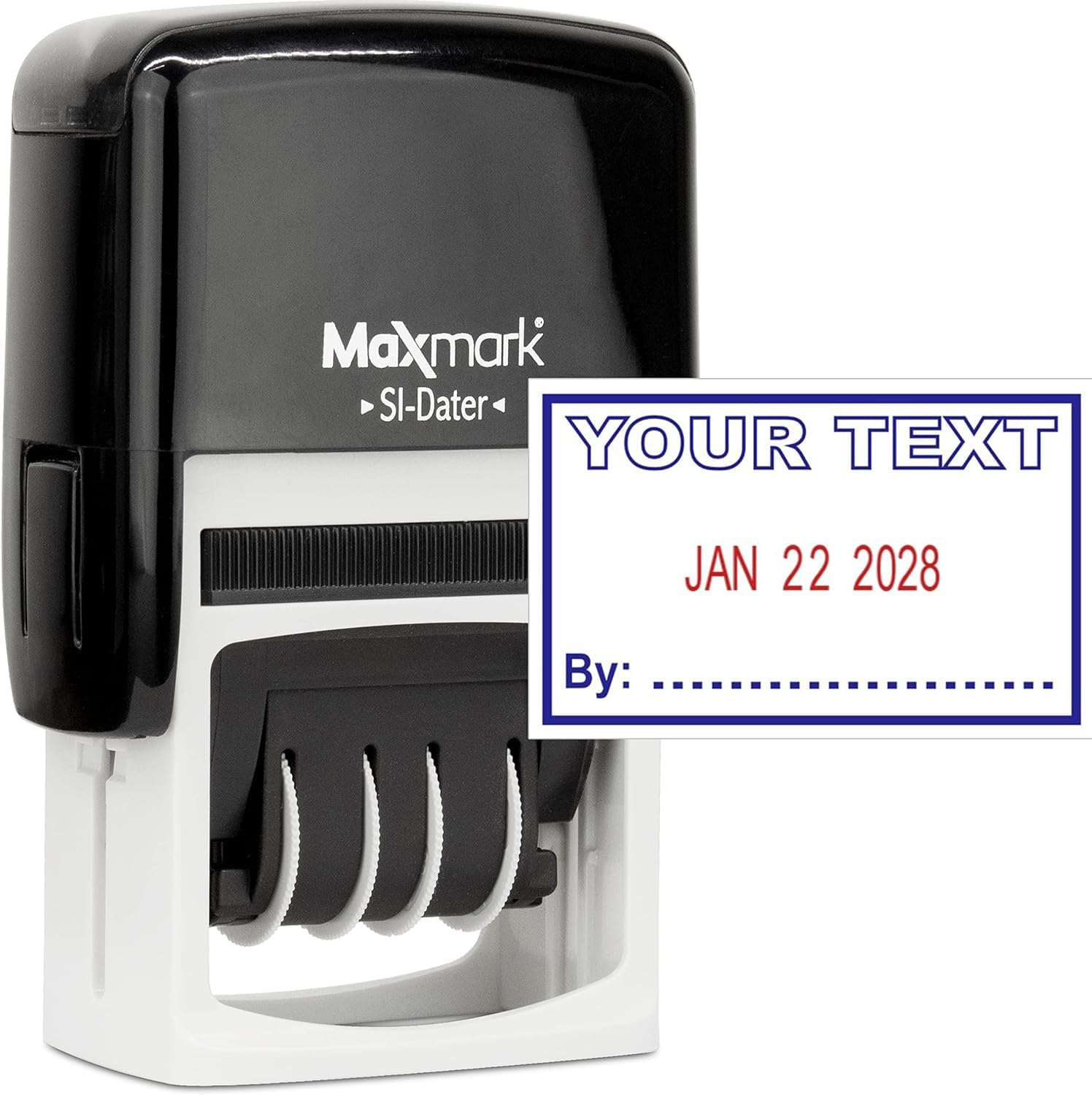 MaxMark Office Date Self Inking Stamp with Your Custom Text - 1" x 1-5/8” - 2-Color Blue/Red Ink