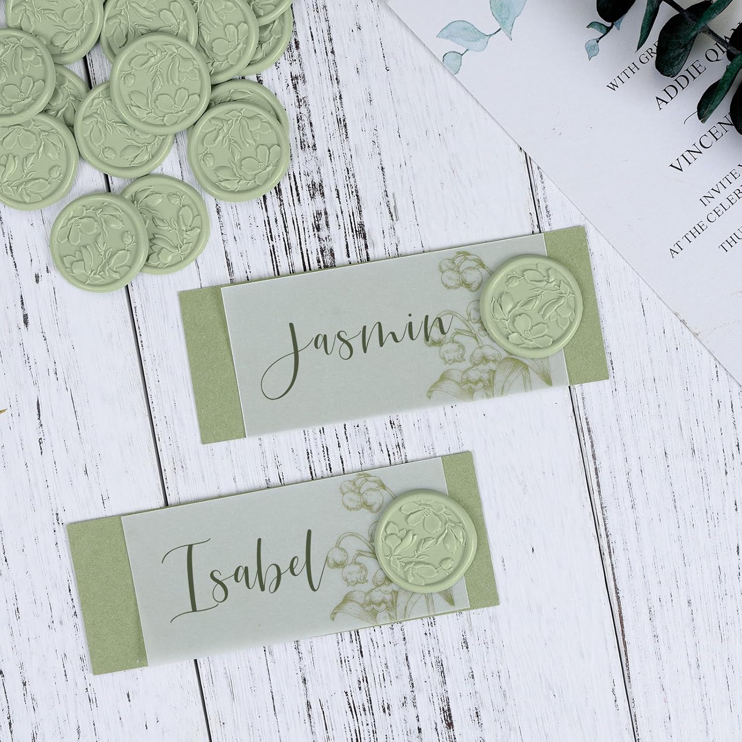 - PACKAGE INCLUDES - You will receive 50 pieces of sage green color wax seal stickers in magnolia designs. The wax seal sticker diameter is 1.2 inches/30mm and with almost the same size of adhesive on the back. Weighs 0.02oz per seal and may add weight to envelopes.