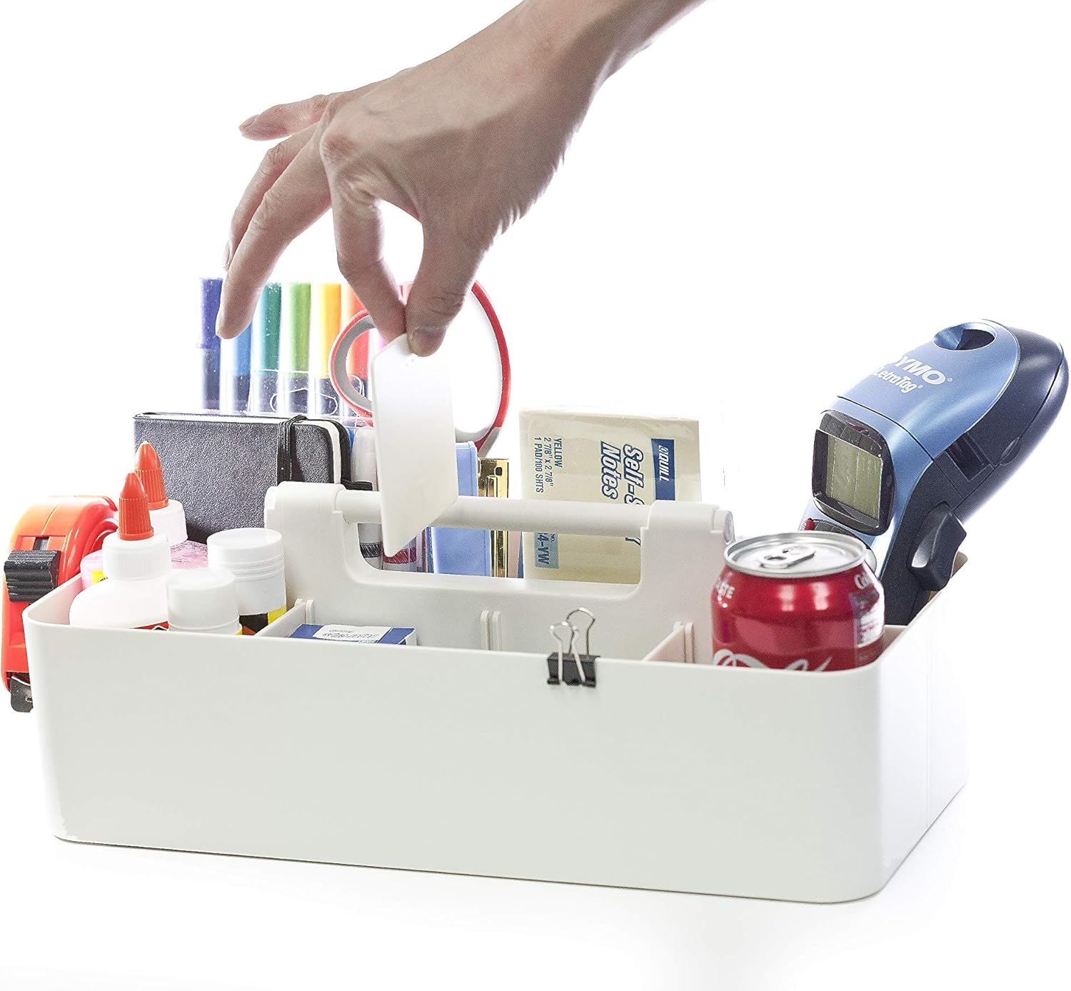 - PORTABLE: Equipped with an easy-carry round smooth handle, this caddy makes transporting goods from shelf to cabinet or desktop a breeze. Just grab and go! The open tops and divided compartments make it easy to see whatβs inside and quickly grab what you need. Use these convenient storage caddies to keep office desk items organized, children's crafting items tidy, and school supplies in check. Perfect for both home and commercial workspaces.