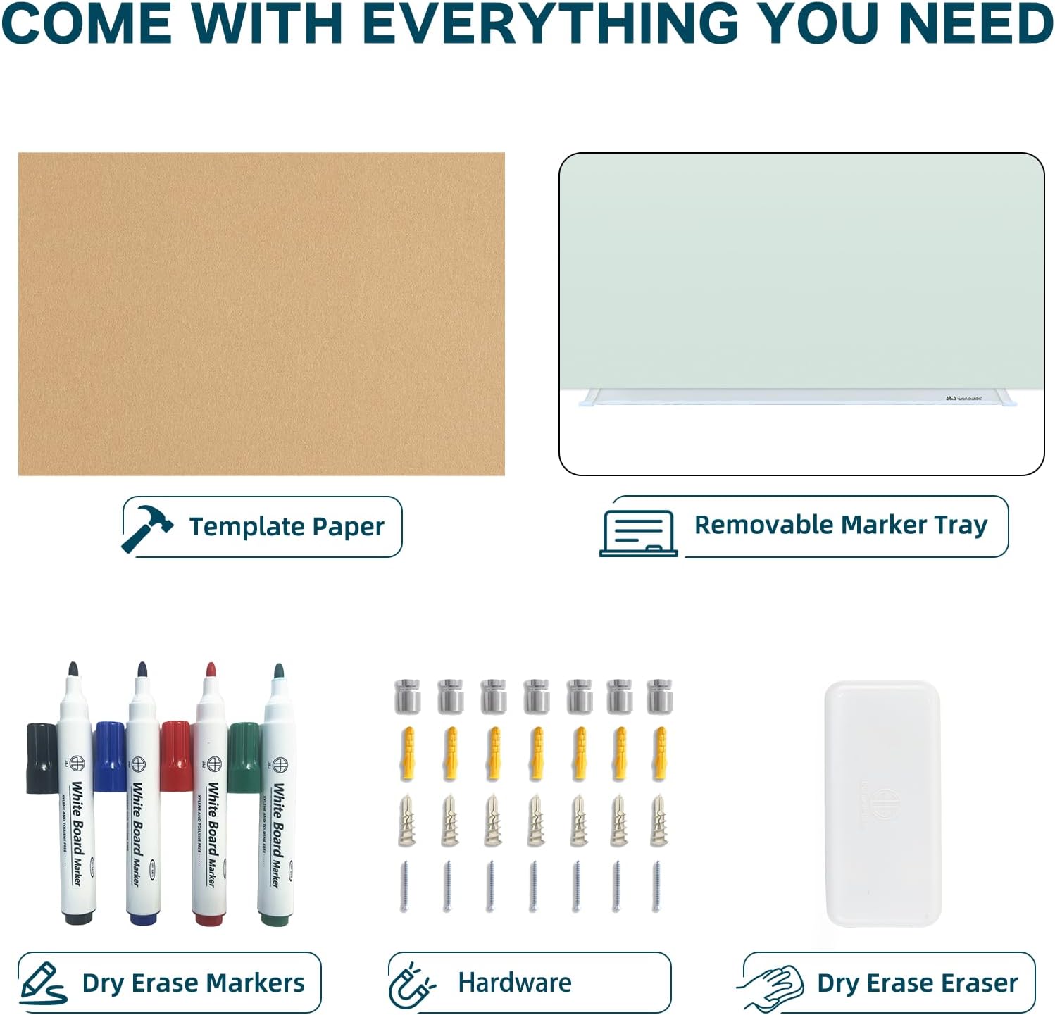 - 【Accessories included】: 4 dry earse markers, 1 glass whiteboard eraser, 1 removable aluminium marker tray, 1 template paper for mounting and 1 set of installation hardware. One stop shopping.