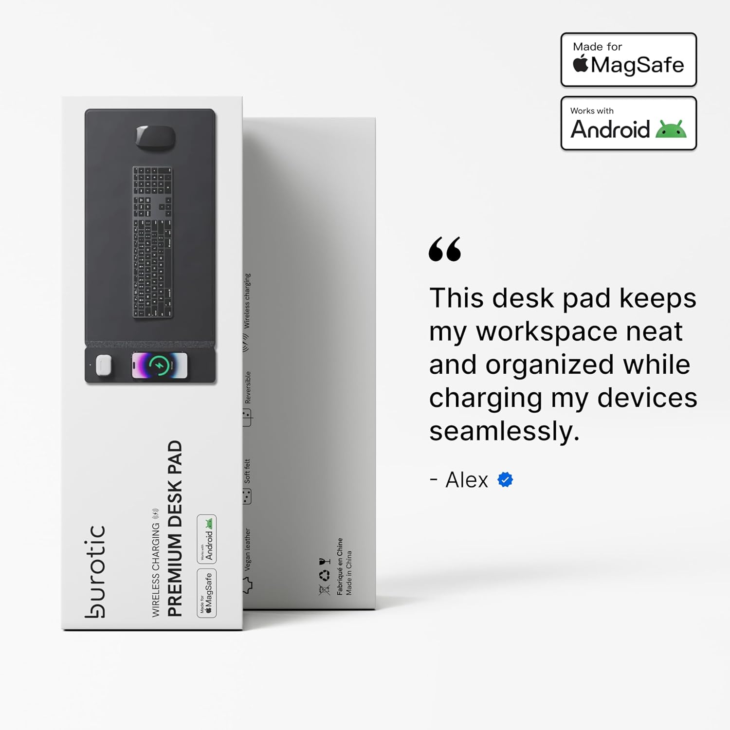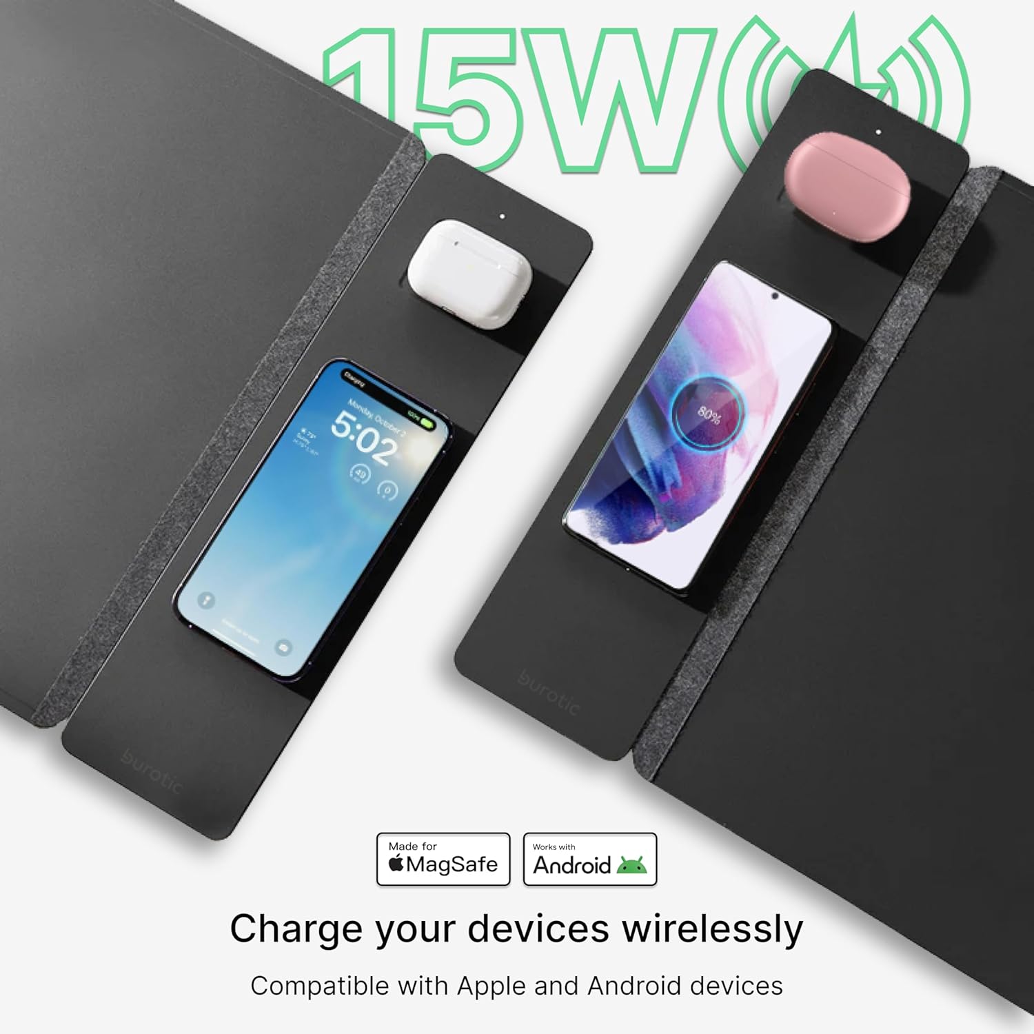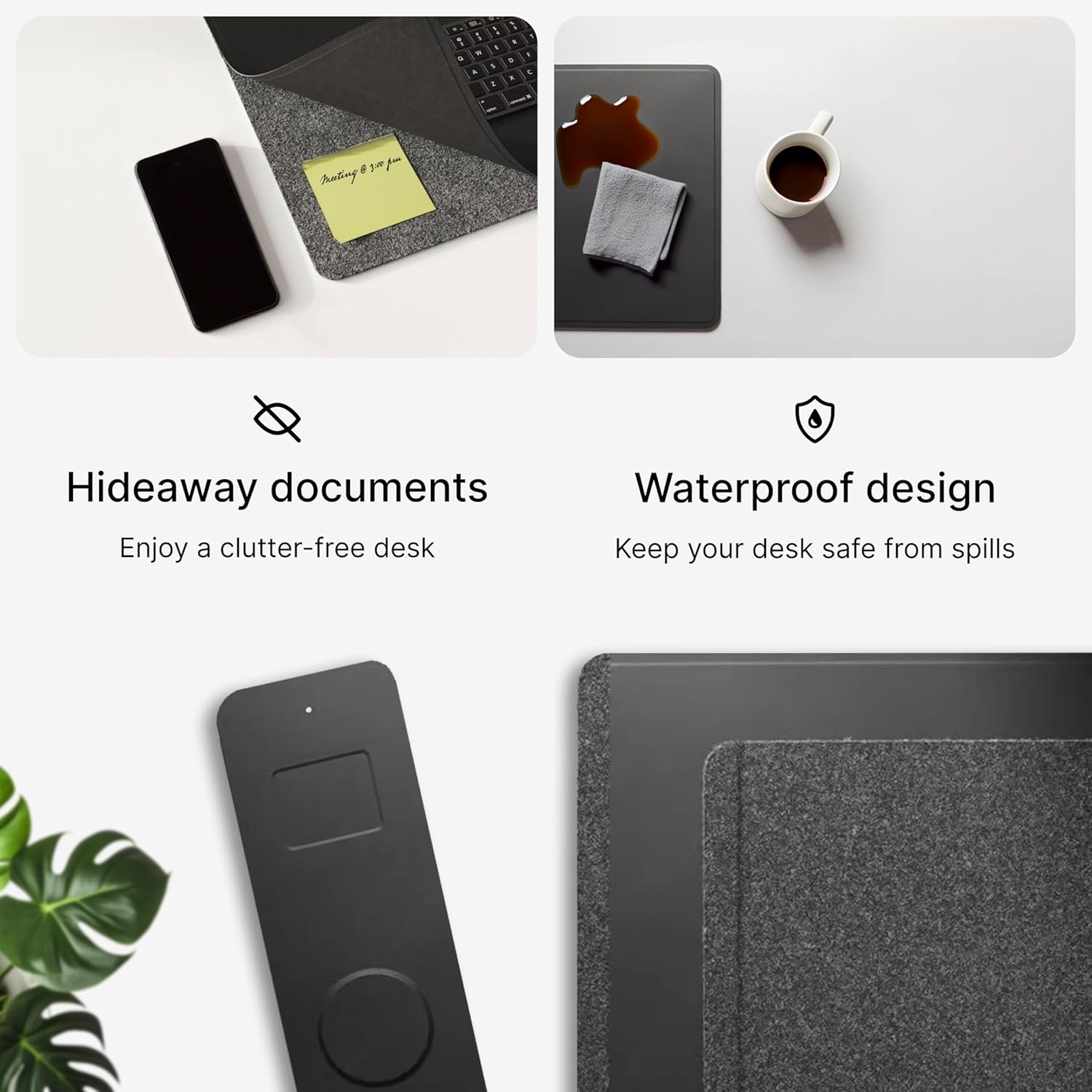 Wireless Charging Desk Pad, Large Non-Slip Reversible Felt & Vegan PU Leather Desk Mat, Waterproof, Detachable Magnetic Panel - Organize, Charge 2 Devices, Apple & Android Compatible - Black