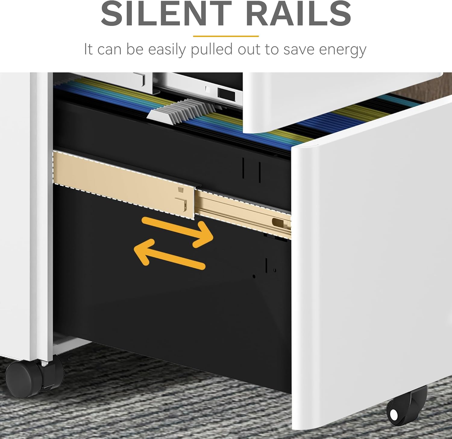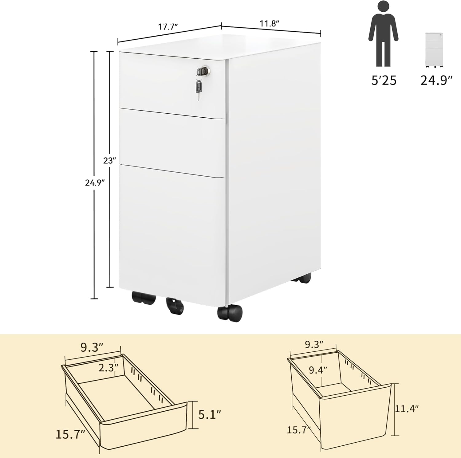 DWVO 3-Drawer Vertical File Cabinet, Mobile Filing Cabinet with Lockable, Pre-Assembled Compact Slim File Cabinet, Portable Office Storage for A4/Letter/Legal Documents (White)