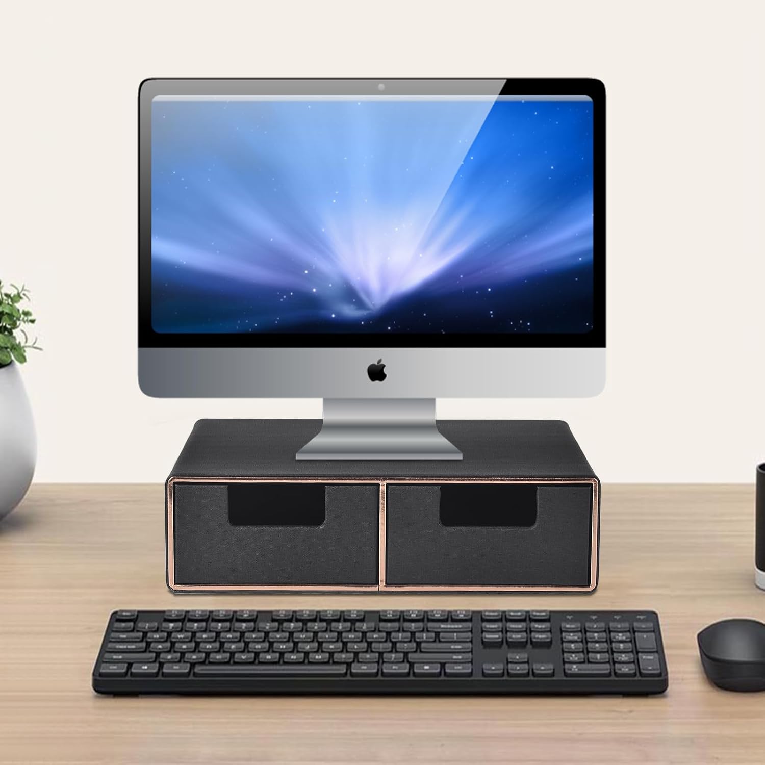 Linen Leather Desk Organizer and monitor stand with Drawers-Mini Desktop Drawer Organizer Stackable-Tabletop Organization Storage Box for Office Supplies Home Vanity Toiletries (Black, 2-drawers)