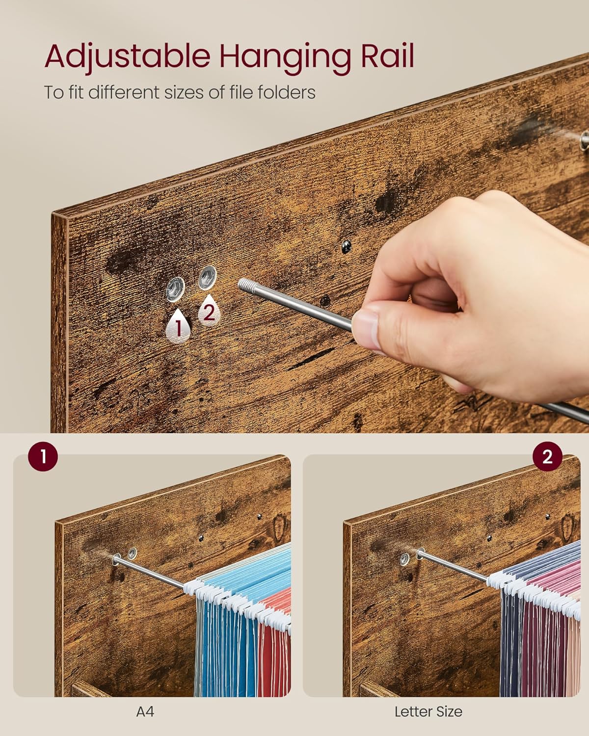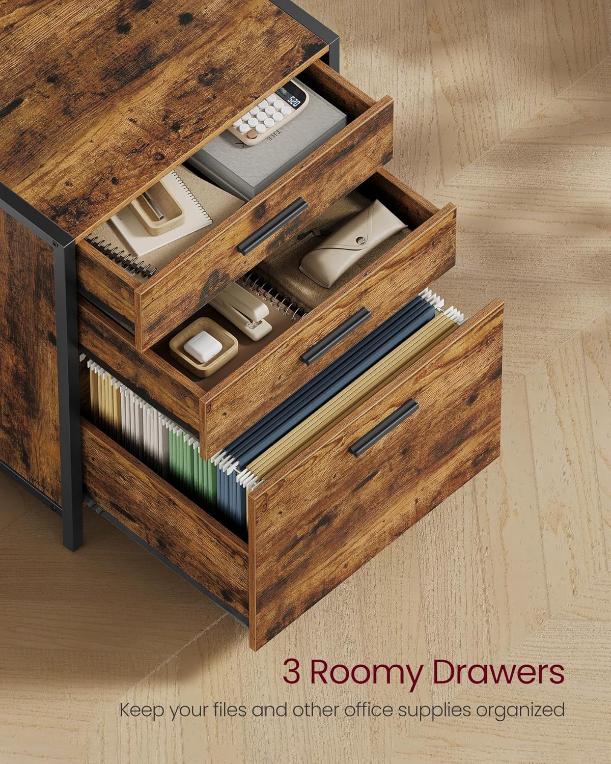 - 【ORGANIZE ALL YOUR FILES】Organize and access your files with ease with this 3-drawer file cabinet. It features a bottom drawer with an adjustable hanging rail to accommodate A4 or letter-size file folders and 2 small drawers for other office supplies