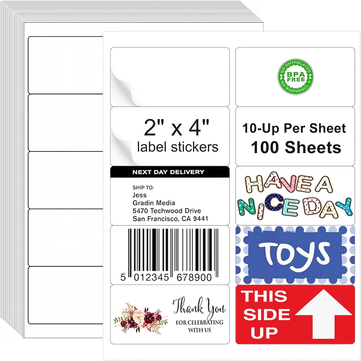 - Label Stickers: The size of each label printer sticker is 2x4 inches, stikcer paper size: 8.5 x 11 inches (US letter size), 10 up small label Per sheet, 100 sheets (1000 matte printable sticker labels). The 2 x 4 address label is suitable for most standard mailing and shipping requirements. And the label stickers supports color printing and handwriting, and is also very suitable as a mailing labels for envelopes, address labels, barcode labels, product label and sticker making