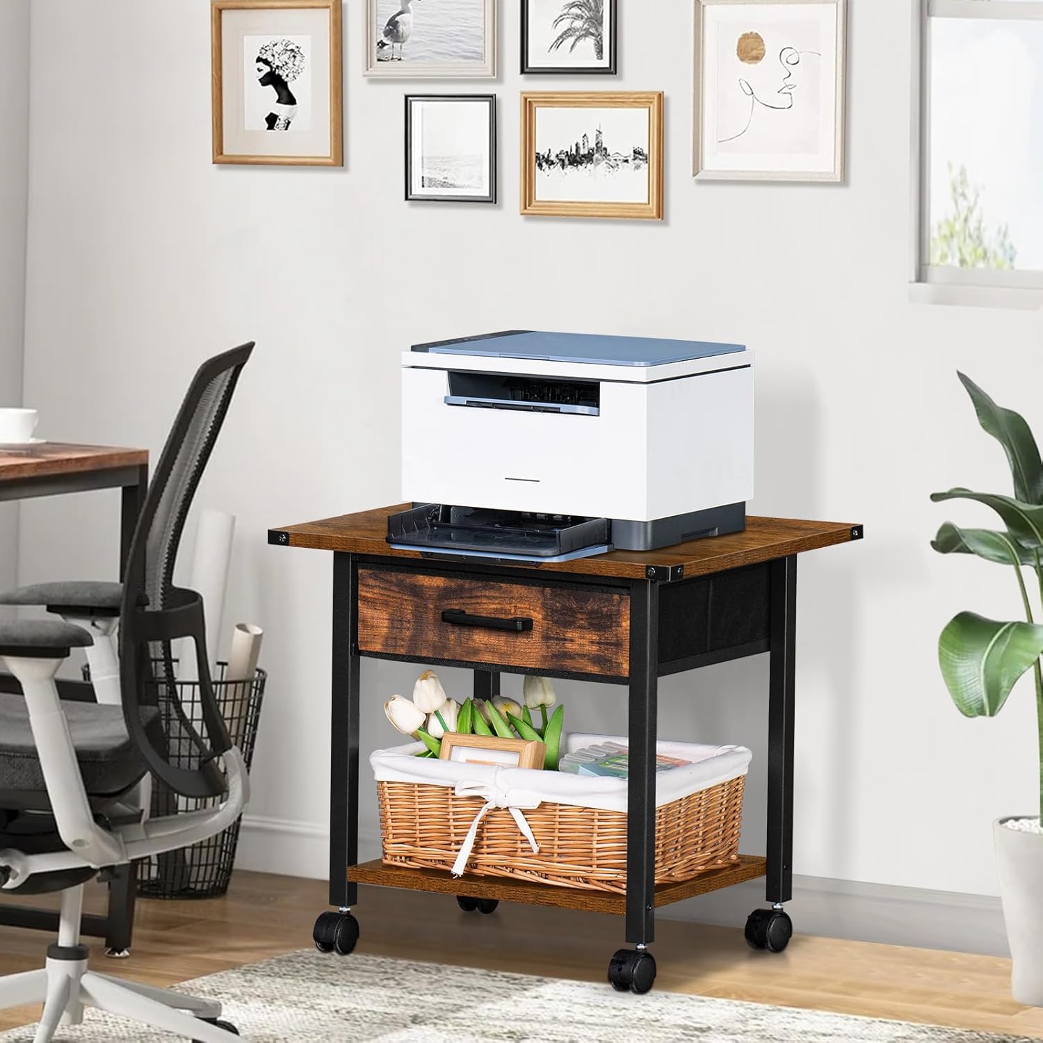 Lerliuo Under Desk Rolling Printer Stand with Drawer, 2-Tier Industrial Mobile Printer Table Desk with Storage Shelf and Steel Frame, Printer Cart Holder with Lockable Wheels for Home, Office (Brown)